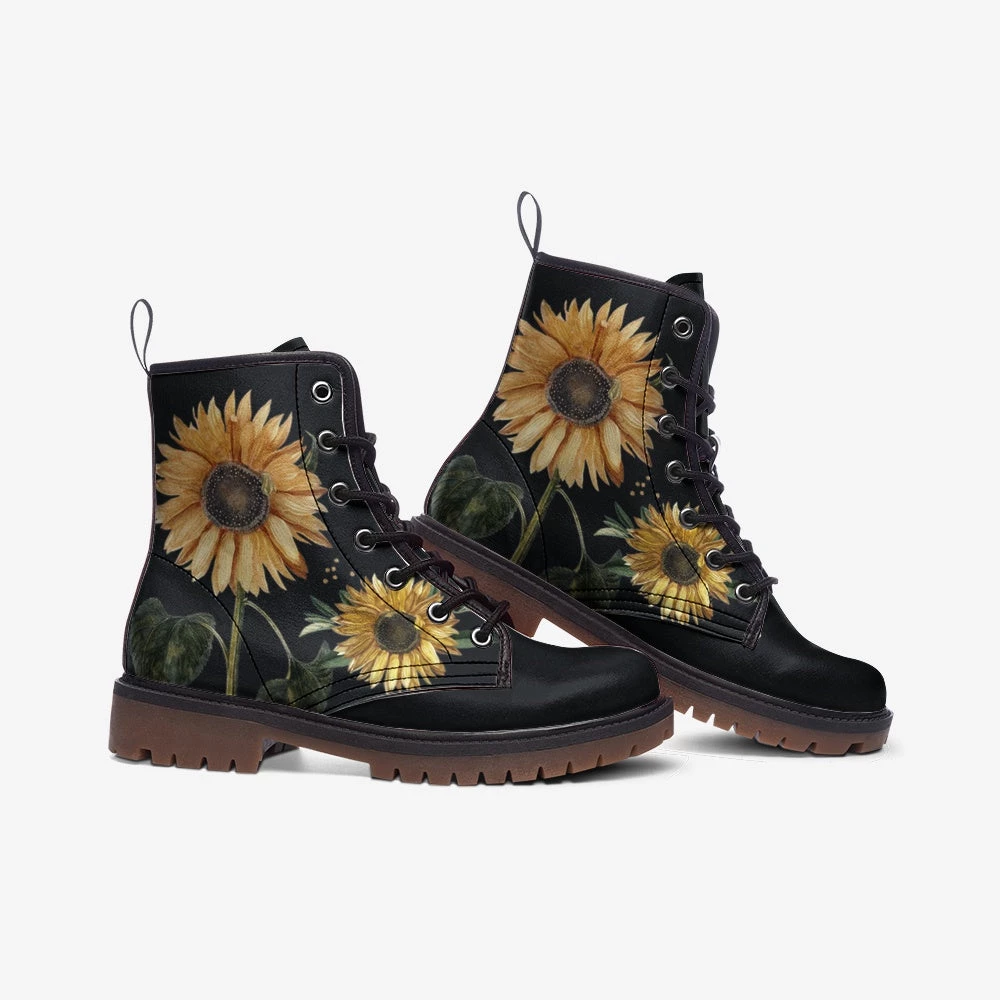 Our Vintage Sunflowers Lace Up Boots feature a vintage sunflower print.