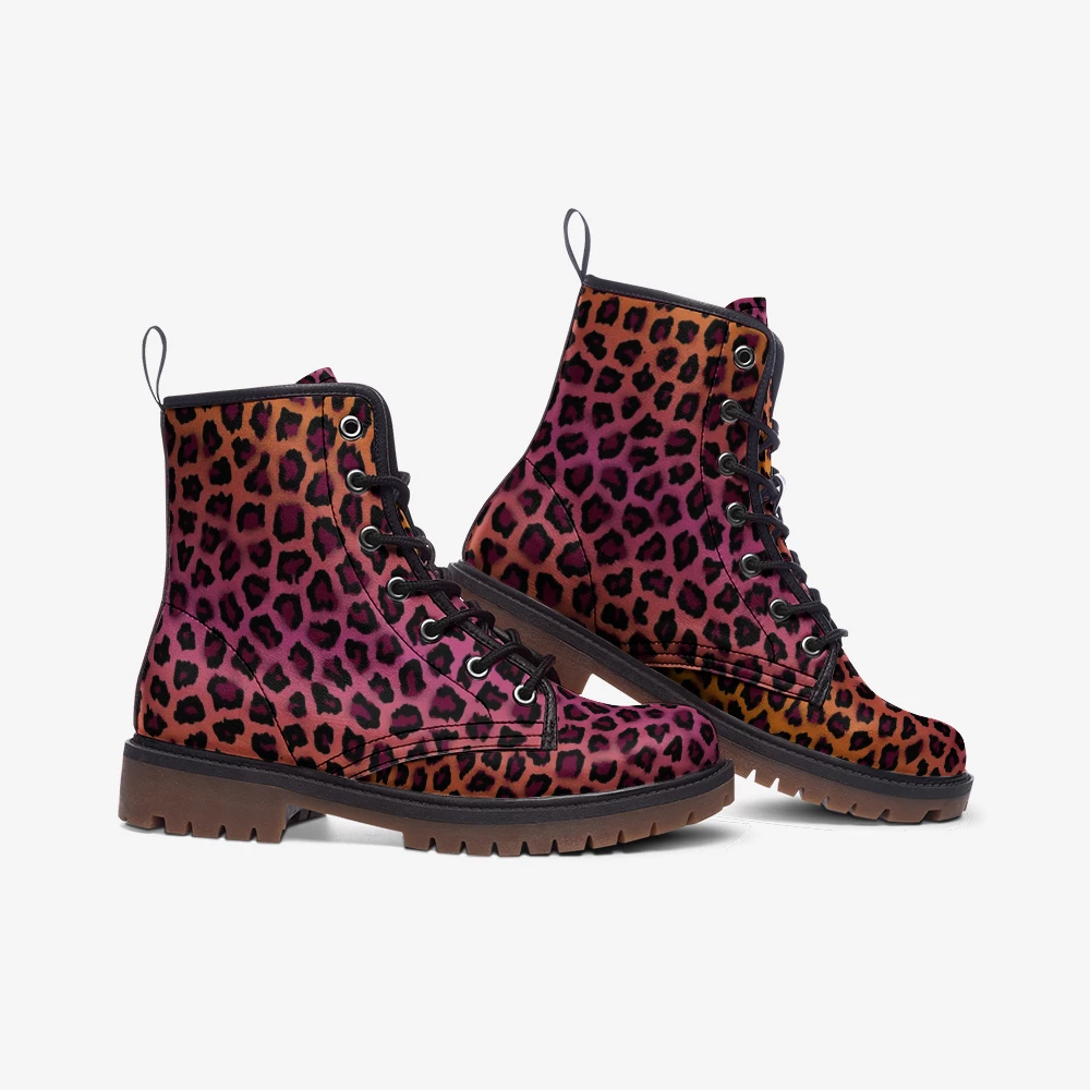 Our hot Vivid Cheetah Lace Up Boots feature a vibrant animal print in shades of golden orange, rose, and black.