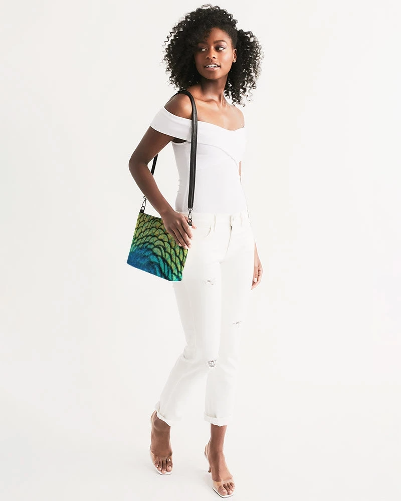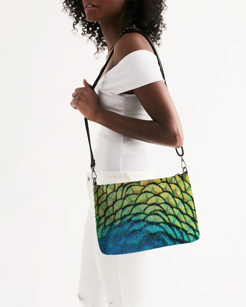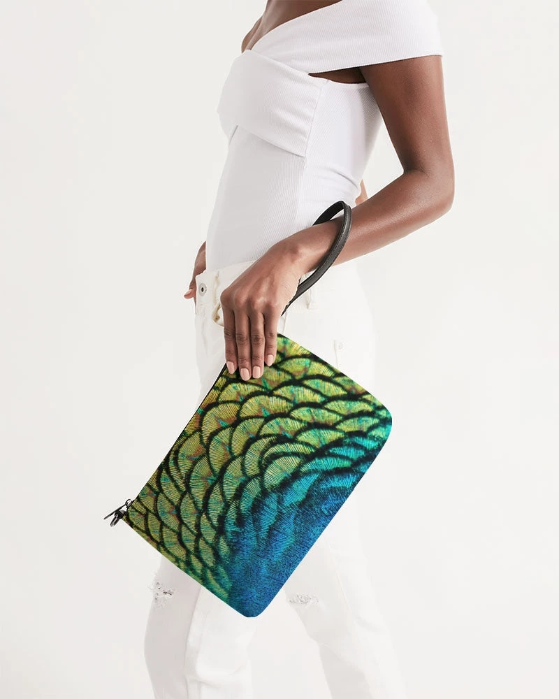 | Small but mighty, our Vivid Peacock Daily Zip Pouch comes with the same perks as our Wristlet, with even more room inside. Removable wrist and shoulder straps allow you to pair this gem with any outfit. Our vivid peacock pouch features bright peacock feathers in green, blue and yellow and gold.