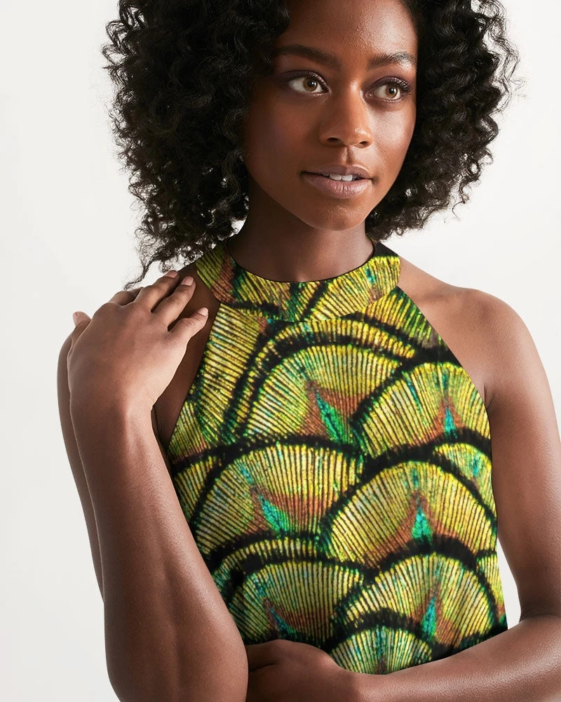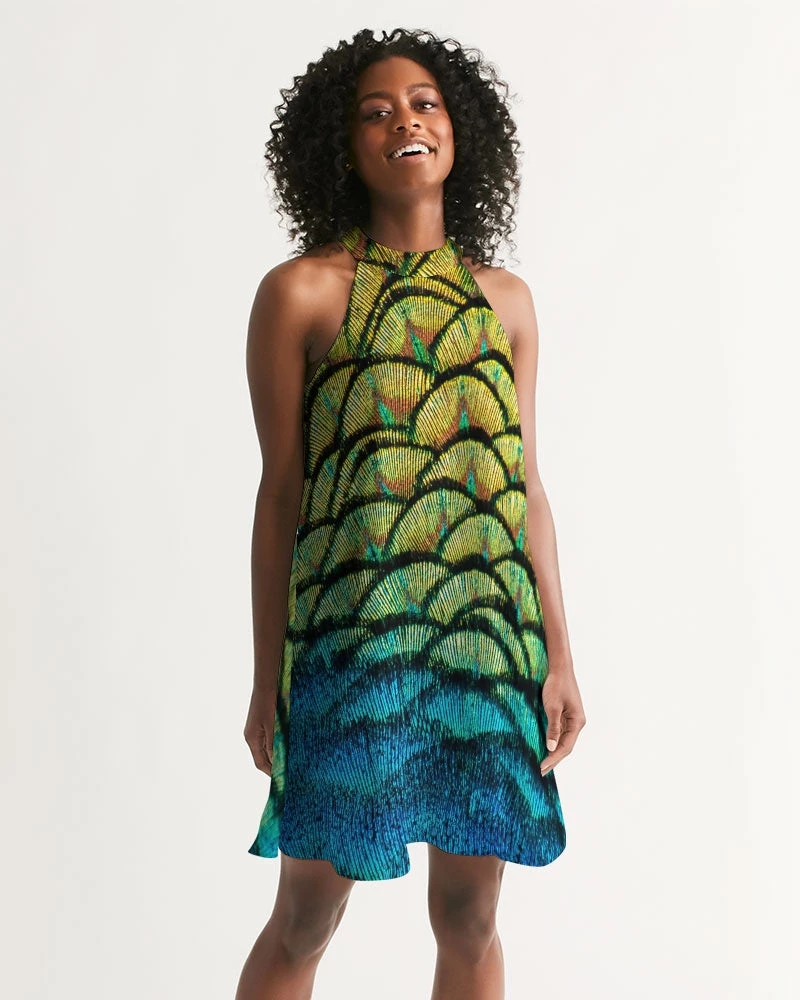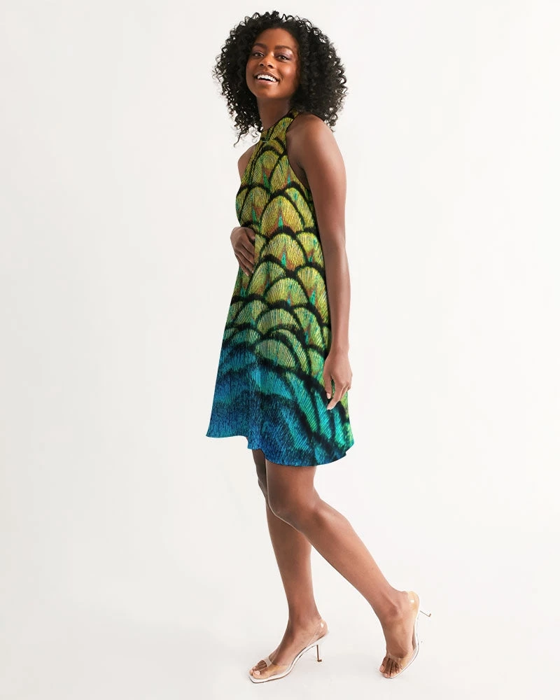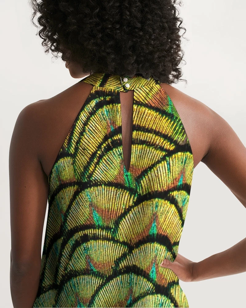 | Our Vivid Peacock Women’s Halter Dress features a stunning train of peacock feathers. Unique and striking. This dress is handmade to order from polyester chiffon material and fastened in the back with two chic pearl buttons. Fully lined for extra comfort and protection.