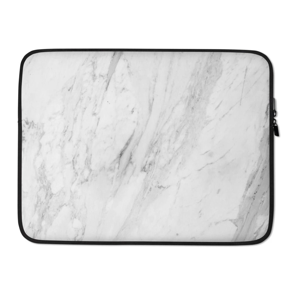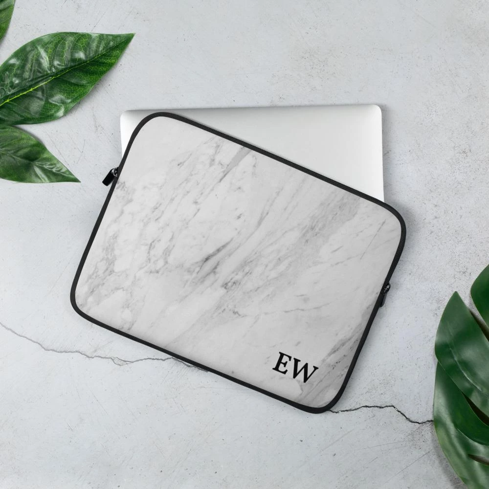 Personalize this contemporary designed marble laptop sleeve with your initials, name, business name or text.