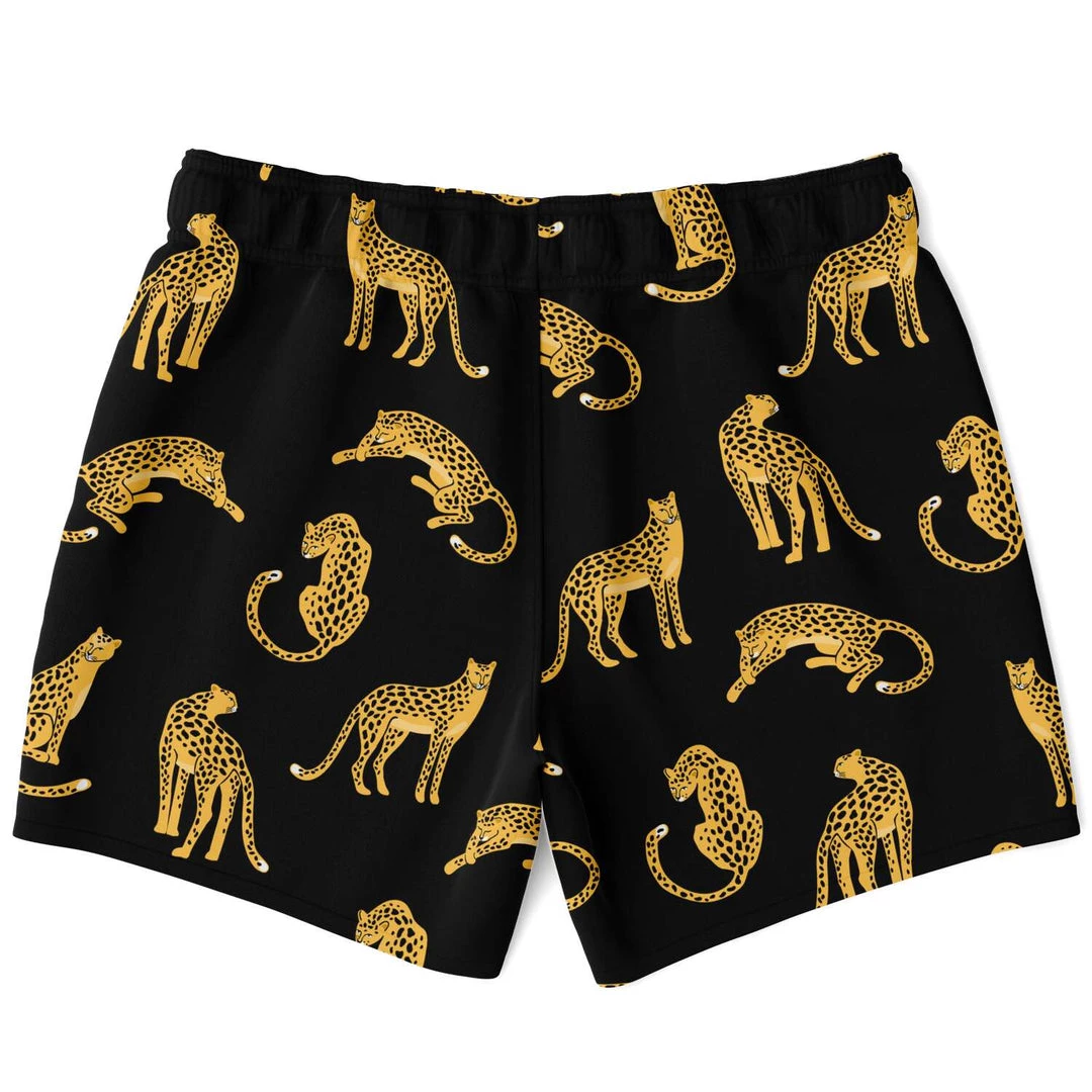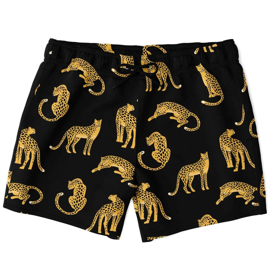 Our Black Leopard Swim Shorts feature a stunning all over leopard print. A short fit, they hit above the knee and are made with a fast dry fabric. They also feature a black drawstring waistband, mesh basket lining and mesh-lined side pockets.