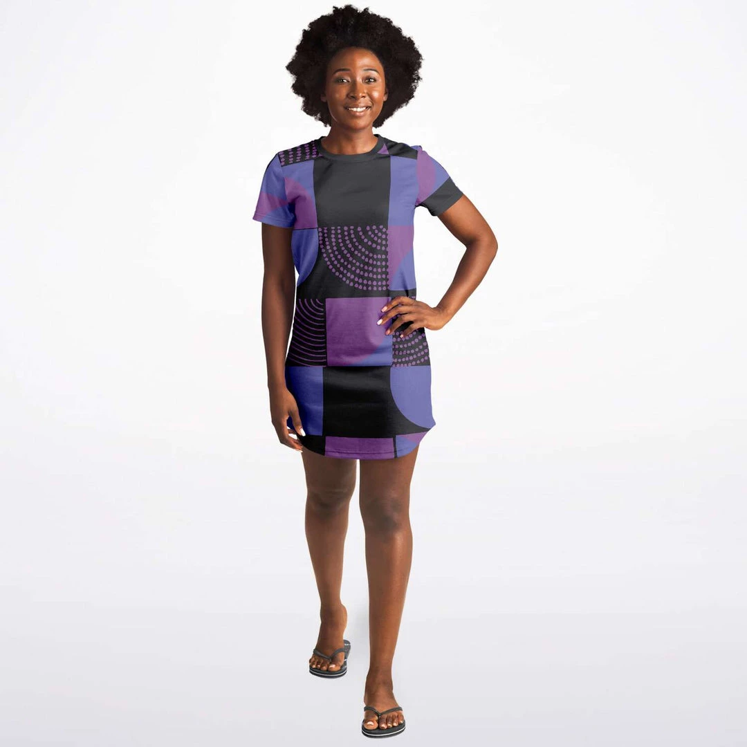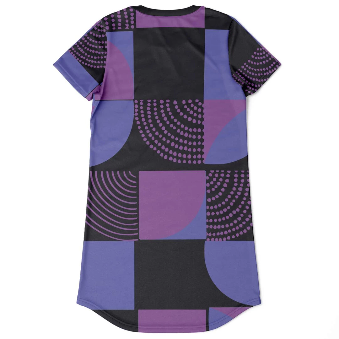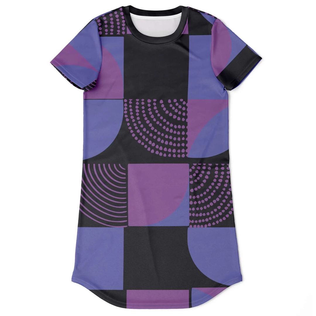 Our Blue Violet Black Geometric T Shirt Dress is as comfortable as your favorite tee, but with added details like a necktape finish and rounded hemline to give it a more stylish look. It’s cute enough for everyday wear, but also special enough to wear out on the town. Perfect for summer but also looks great when layered over pants or leggings during colder months.