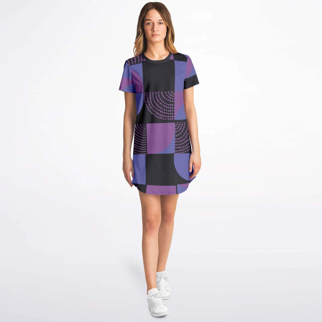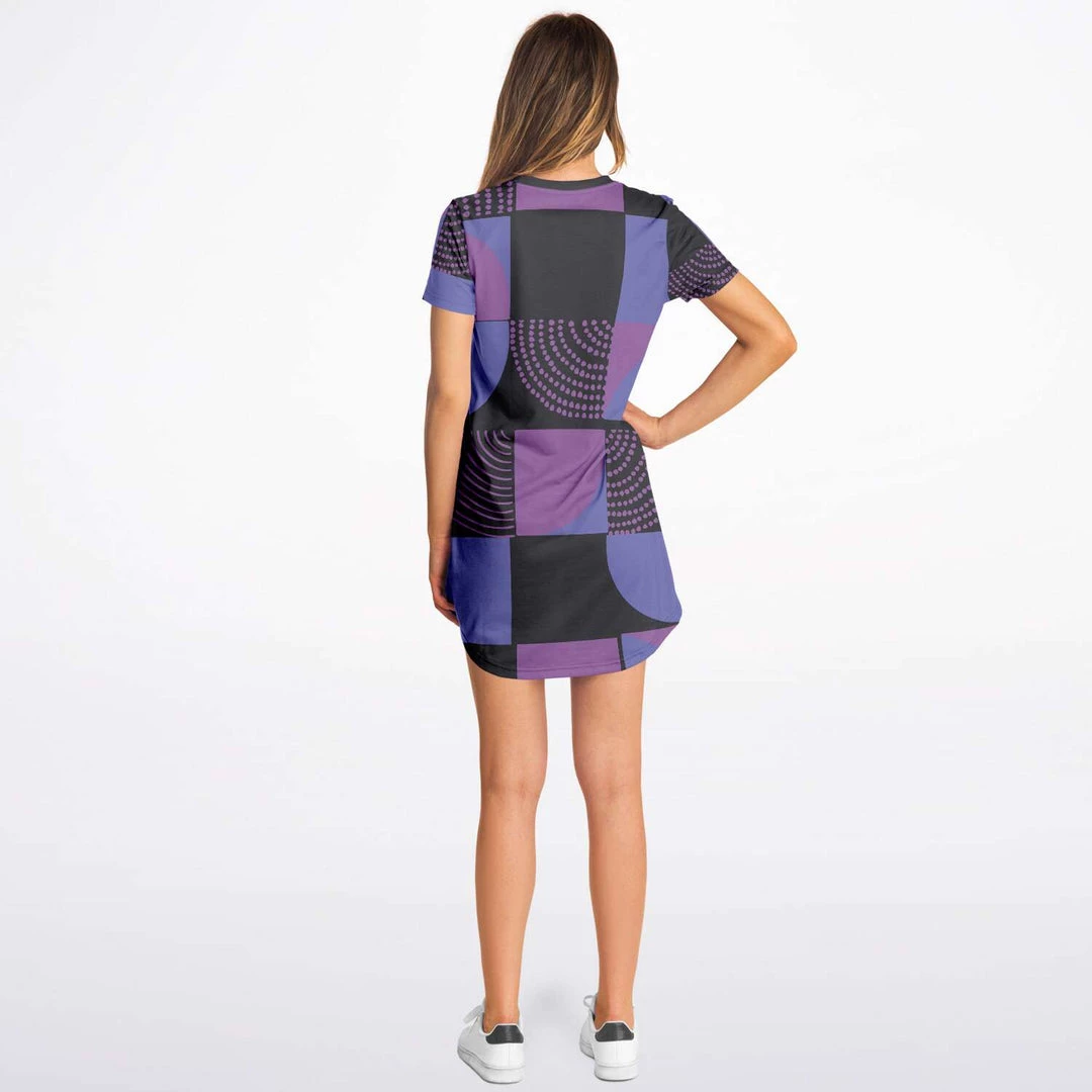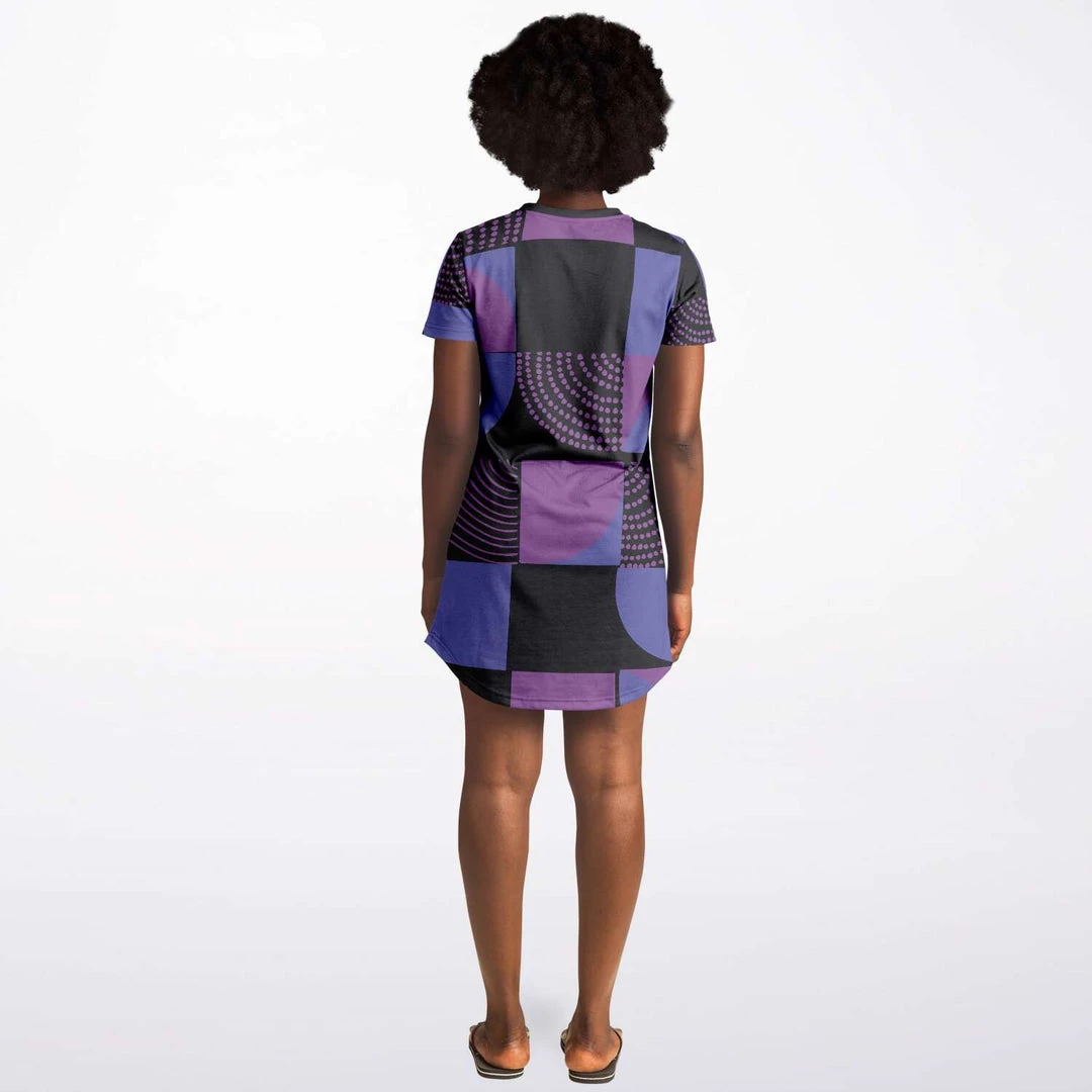 Our Blue Violet Black Geometric T Shirt Dress is as comfortable as your favorite tee, but with added details like a necktape finish and rounded hemline to give it a more stylish look. It’s cute enough for everyday wear, but also special enough to wear out on the town. Perfect for summer but also looks great when layered over pants or leggings during colder months.