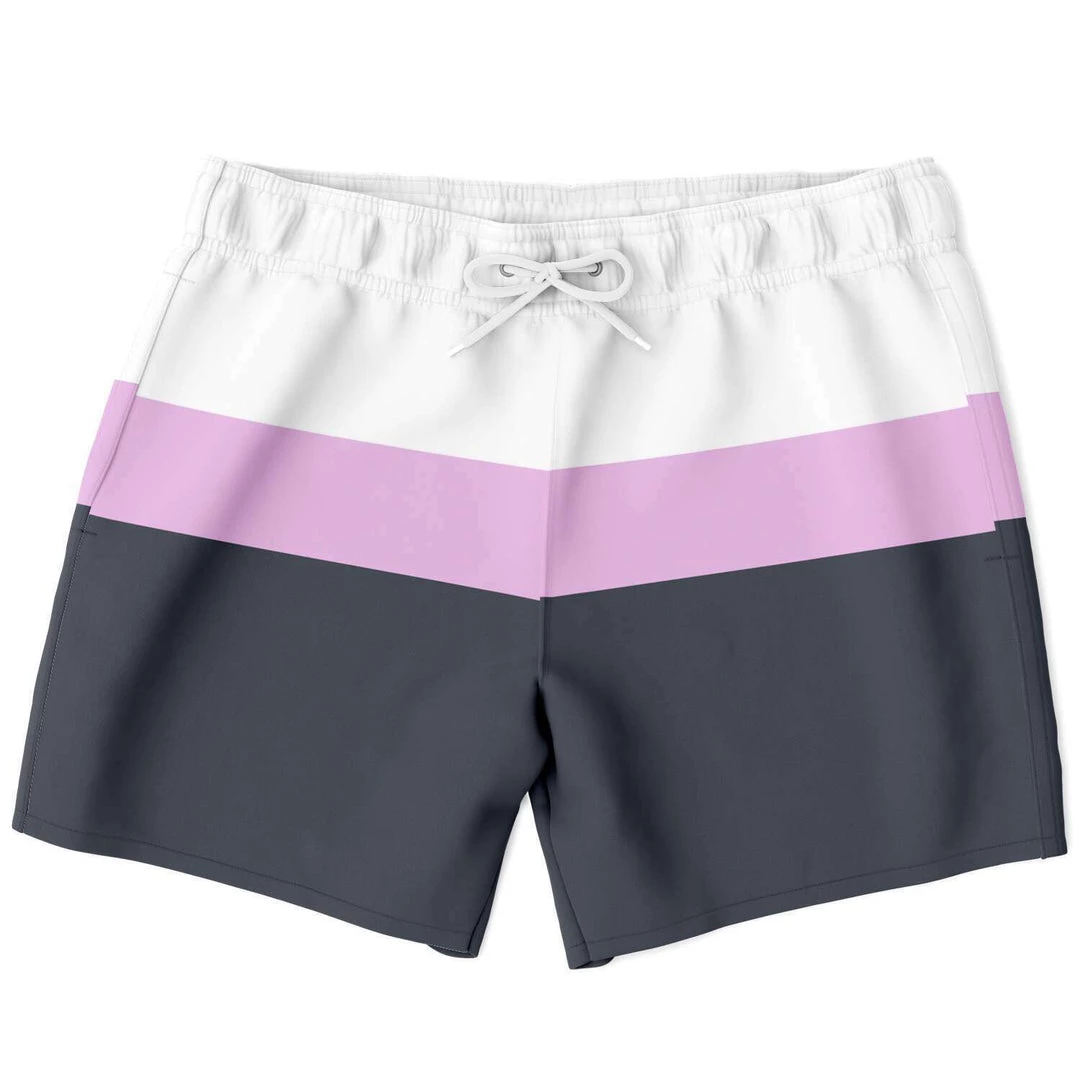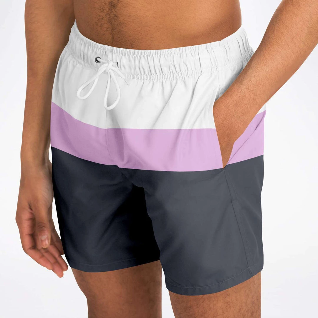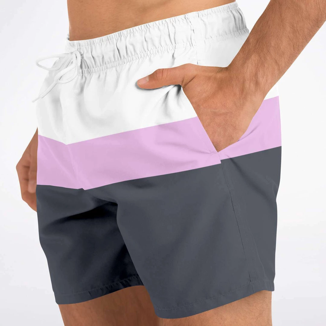 Our Charcoal Pink Swim Shorts feature simple stripes in black & blue charcoal, pink and white. These shorter-length swim trunks hit above the knee. They come in a fast-dry fabric, and feature a drawstring waistband, mesh basket lining and mesh-lined side pockets.