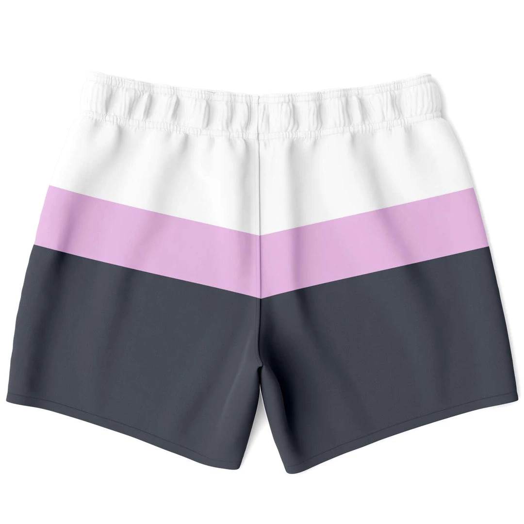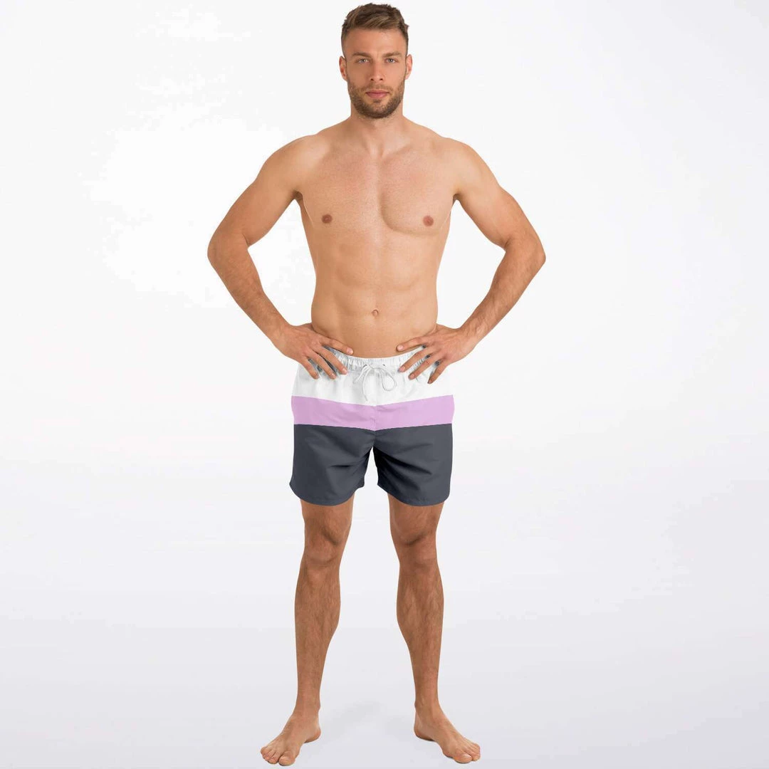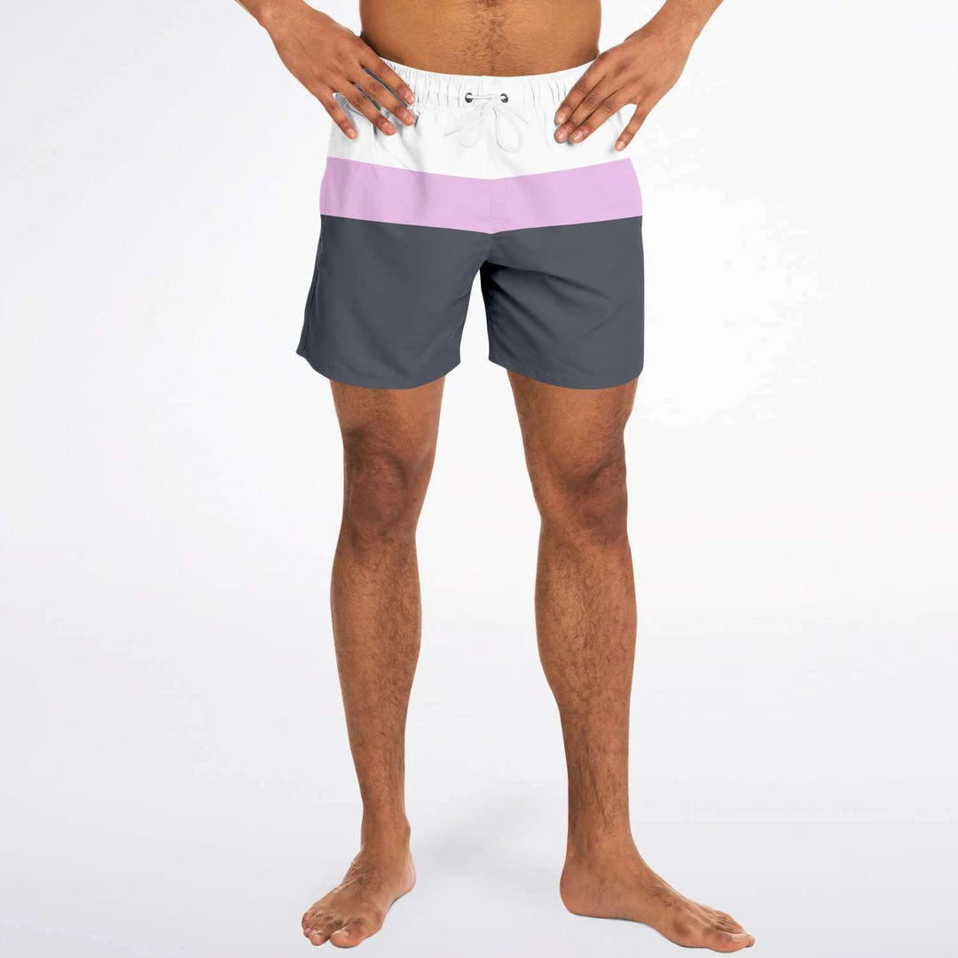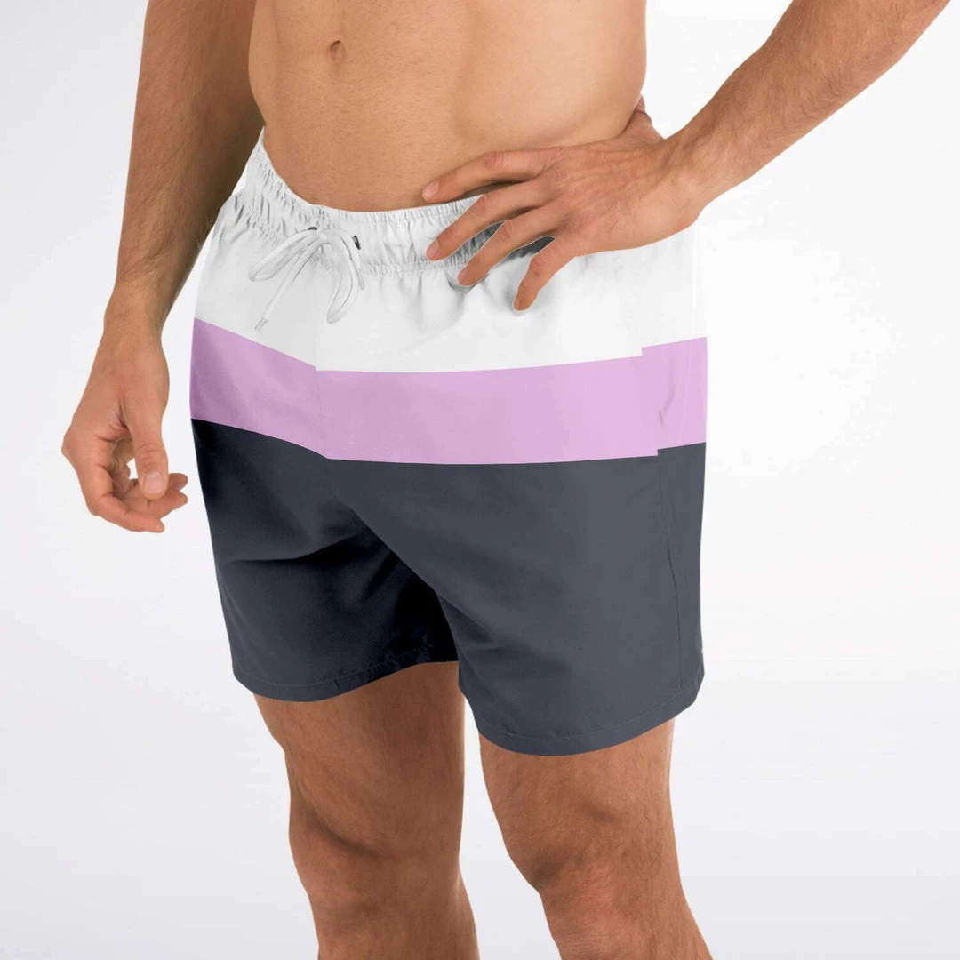 Our Charcoal Pink Swim Shorts feature simple stripes in black & blue charcoal, pink and white. These shorter-length swim trunks hit above the knee. They come in a fast-dry fabric, and feature a drawstring waistband, mesh basket lining and mesh-lined side pockets.