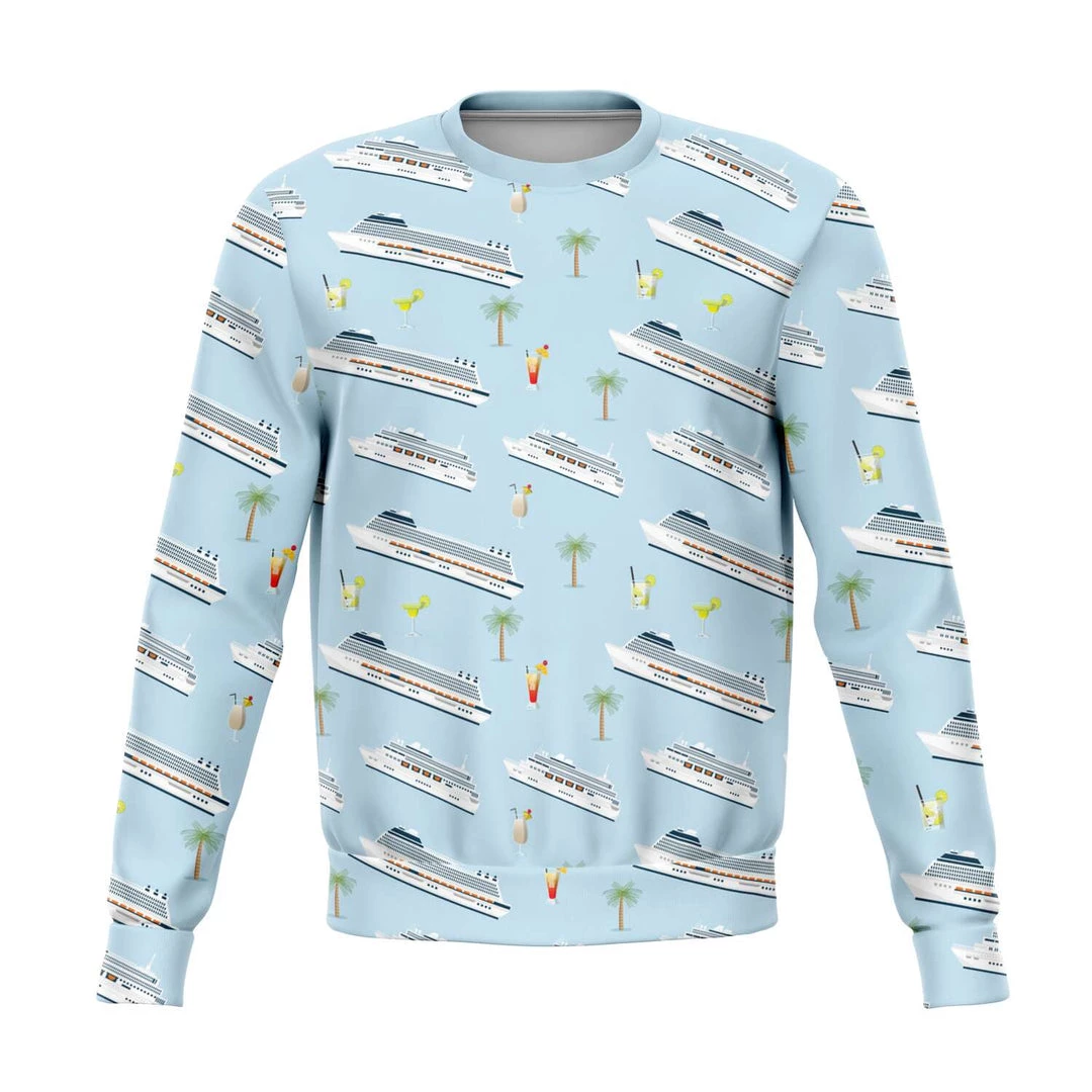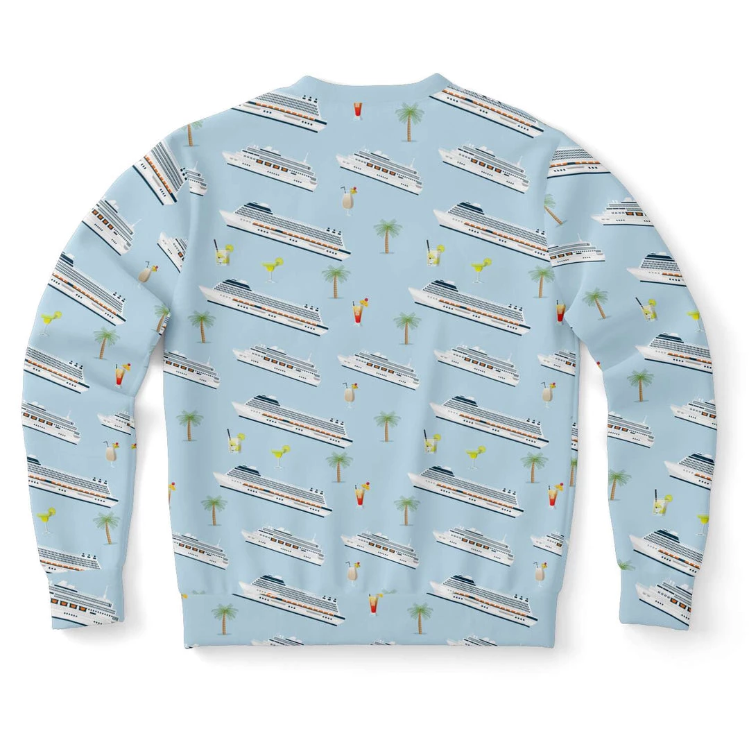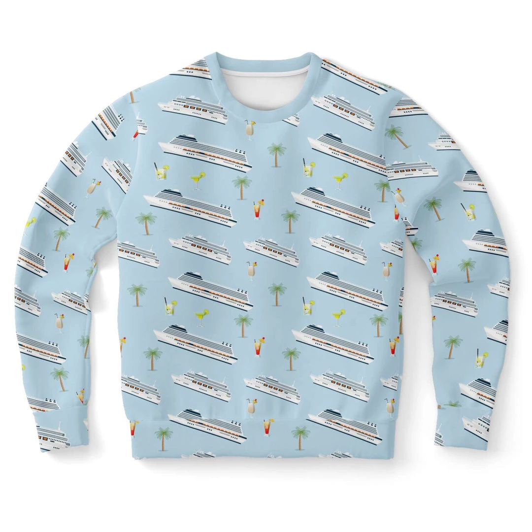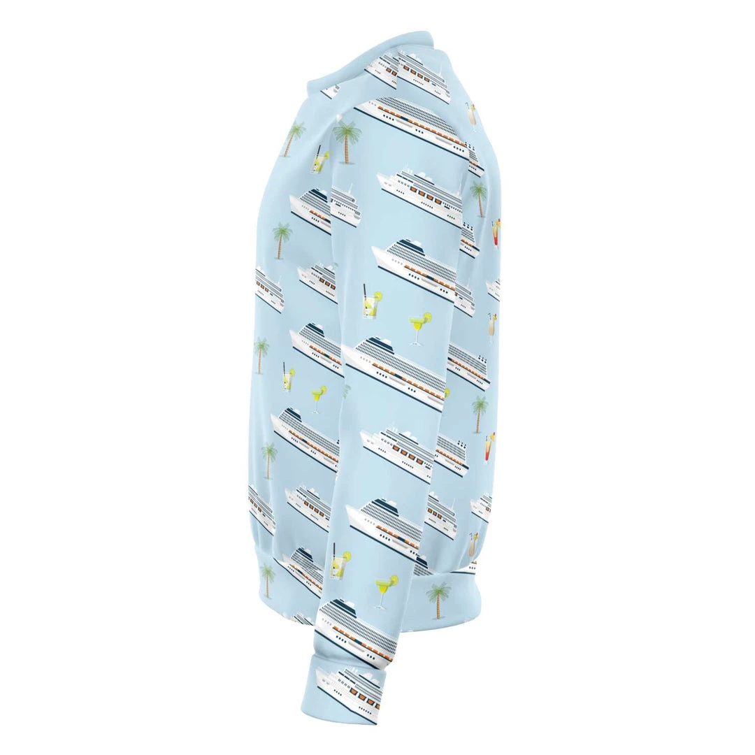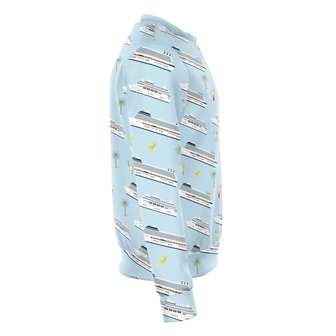 Our Cruise Lovers Unisex Sweatshirt has an all over print featuring cruise ships, cocktails and palm trees. It has a soft, durable fabric and brushed fleece on the inside. Great for keeping you warm on cold days and cool evenings.