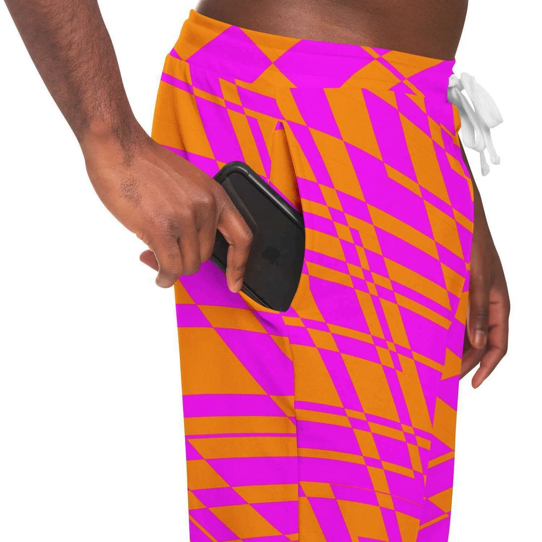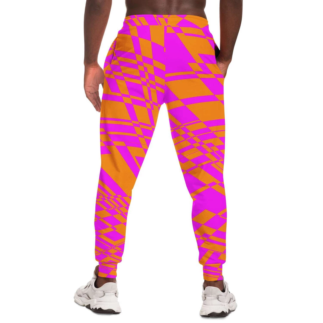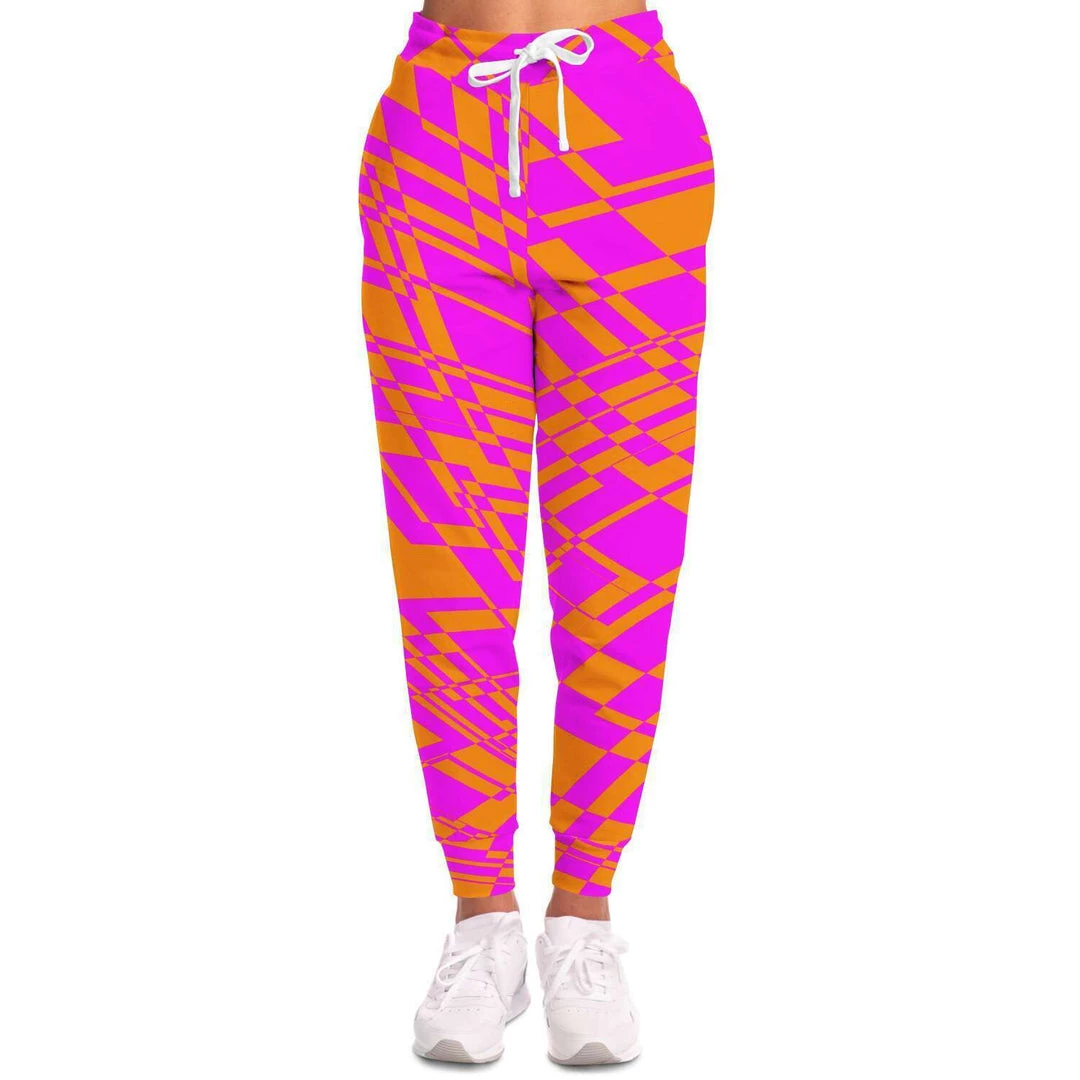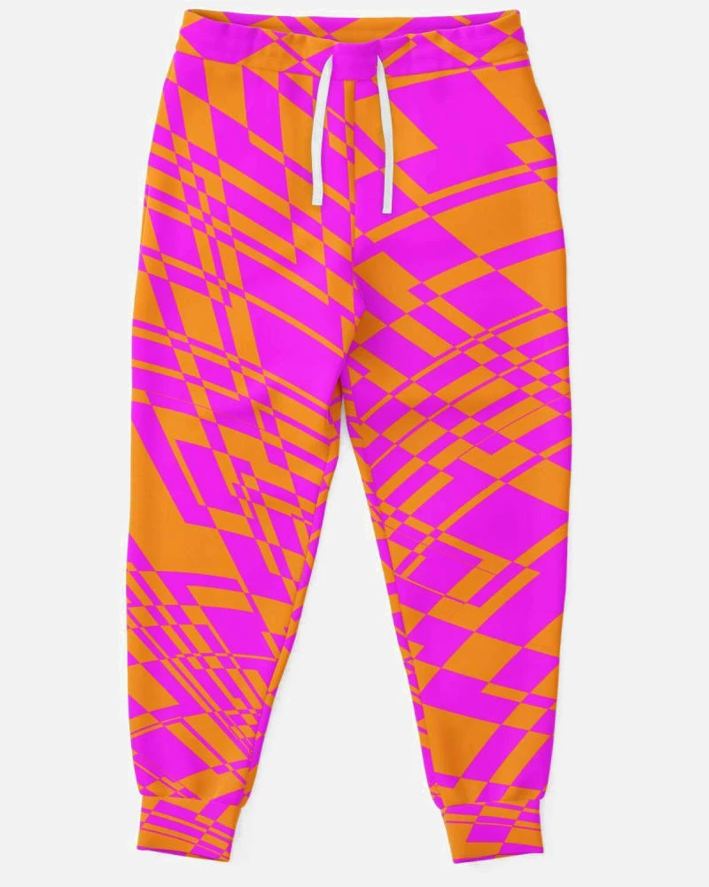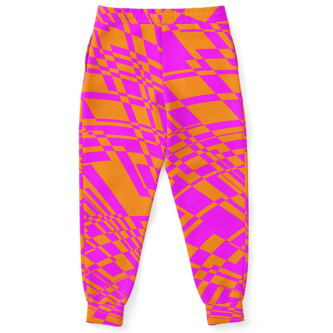 Our Fuchsia & Orange Warp Unisex joggers feature a vibrant all over abstract check print. Pairs perfectly with a black or white tee, hoodie or sweatshirt to add some vibrance to your outfit. These unique unisex joggers feature a soft and durable fabric that have a cotton feel. The brushed fleece on the inside adds warmth and comfort for lounging, camping, hiking or your daily routine.