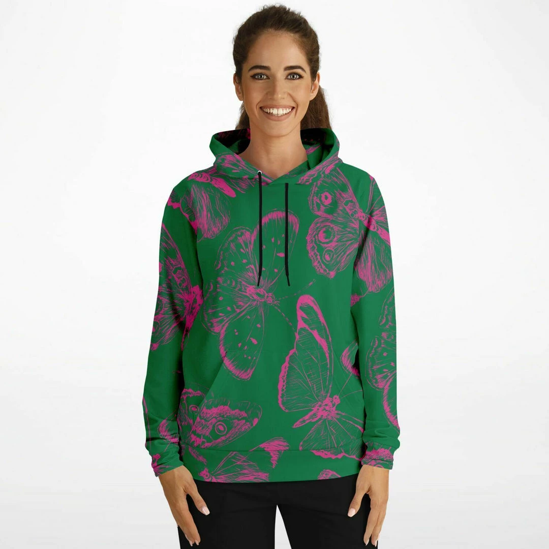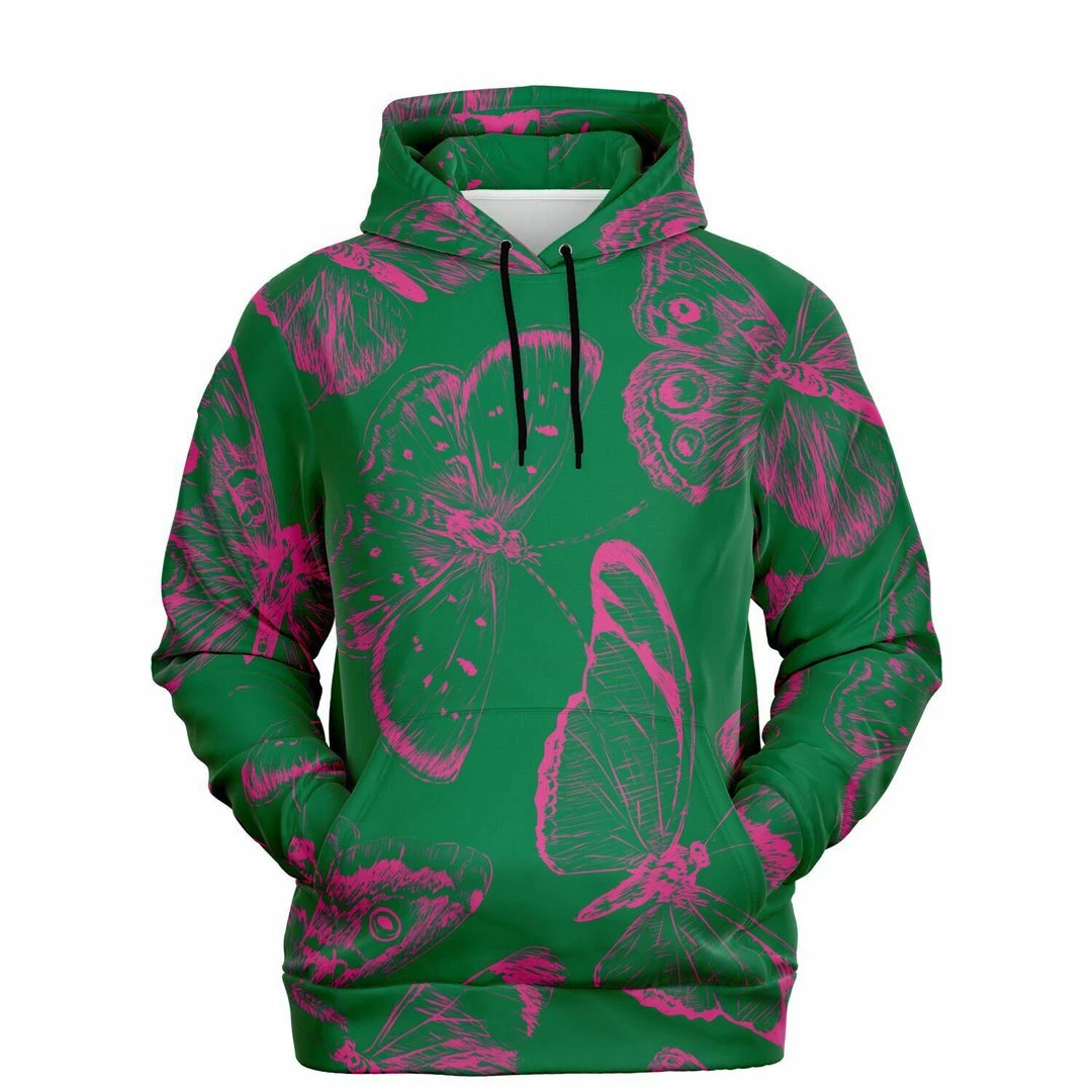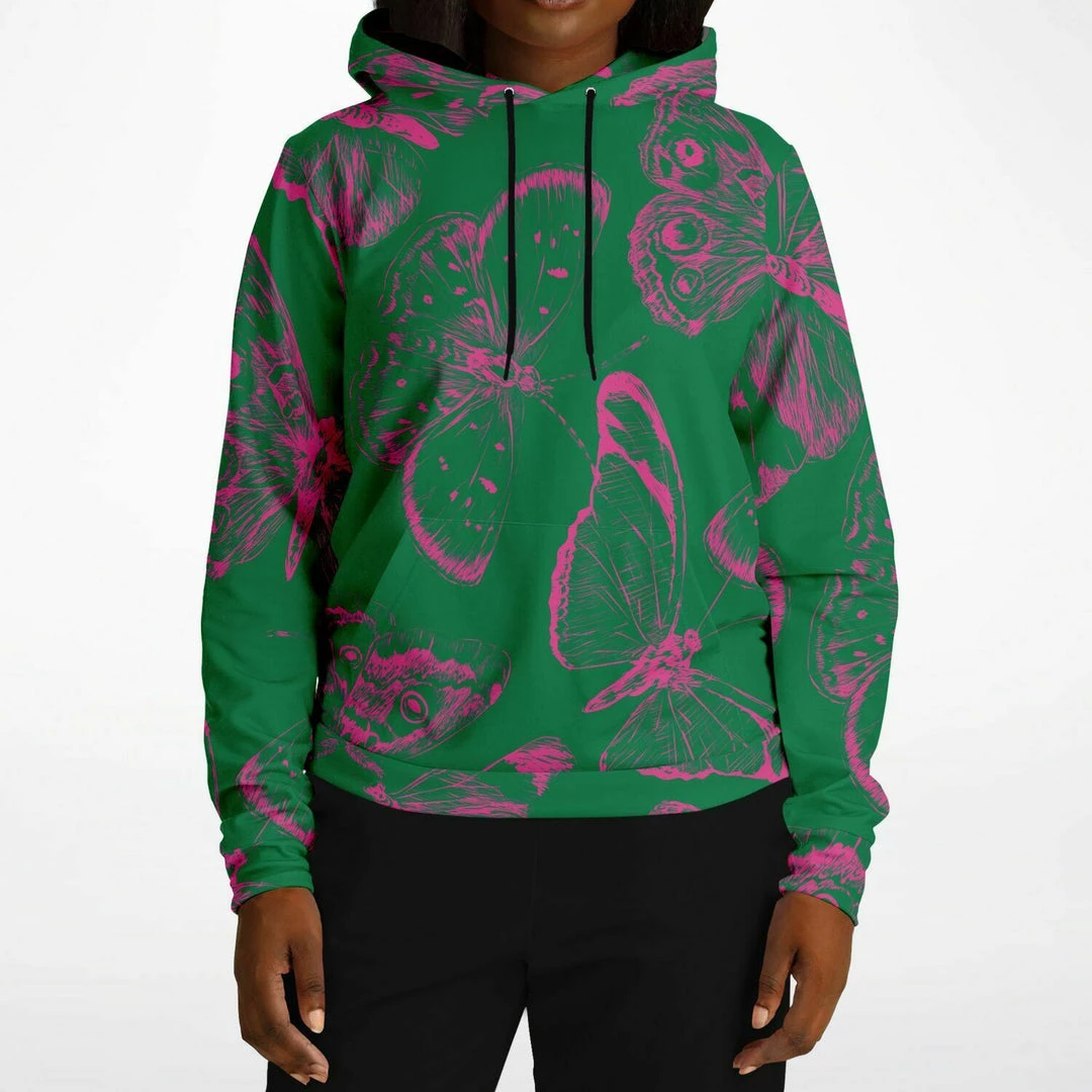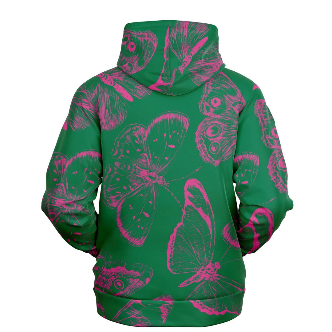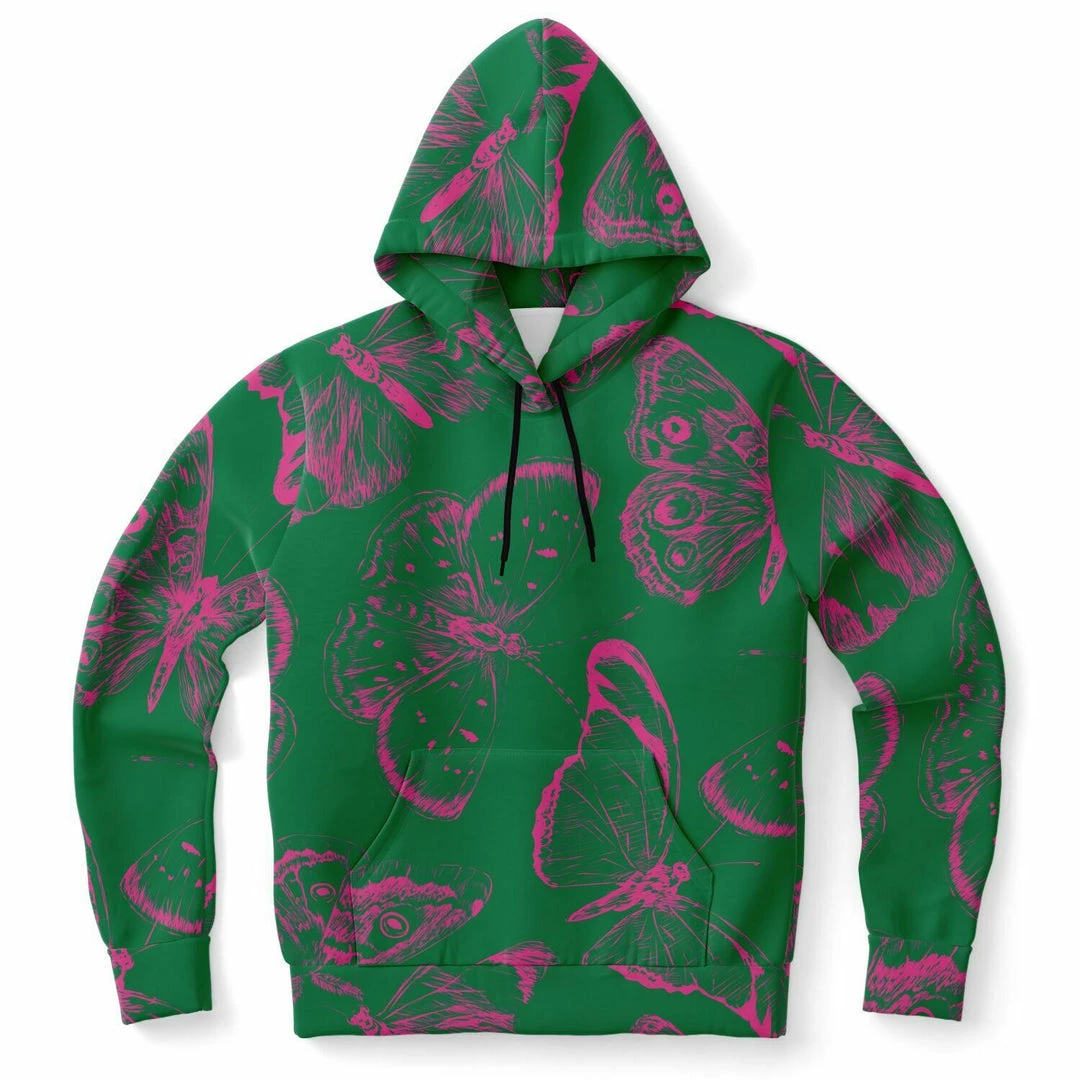 Our Green Fuchsia Butterflies Unisex Hoodie is totally unique. The all over vintage butterfly print in fuchsia and green provides a lift to your outfit.