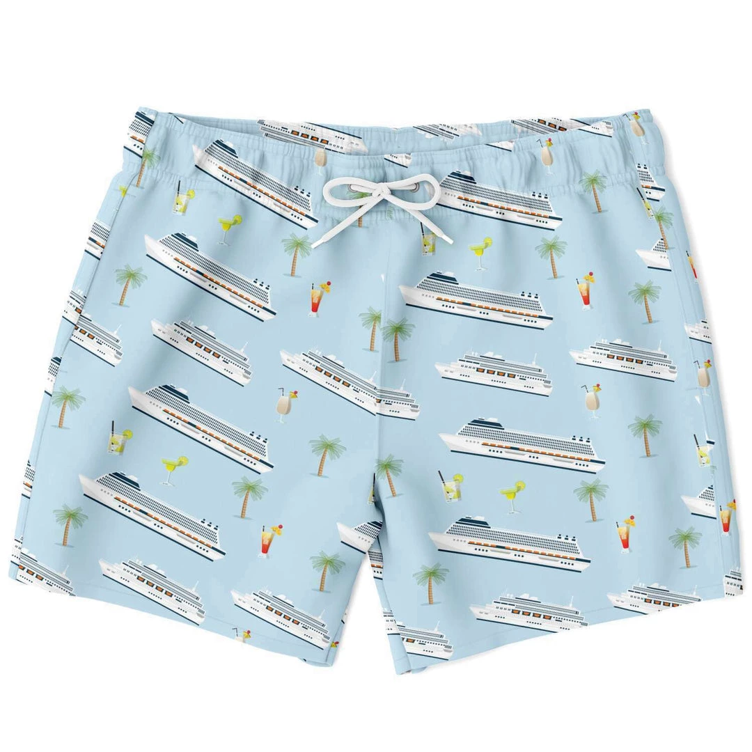 Our cruise lovers swim shorts feature a diagonal cruise ship pattern with cocktails and palm trees. Perfect for summer or a gift for avid cruisers. The short length fit allows you to show a bit of leg, while the fast-dry fabric is perfect when on the go. They also feature a drawstring waistband, mesh basket lining and mesh-lined side pockets.