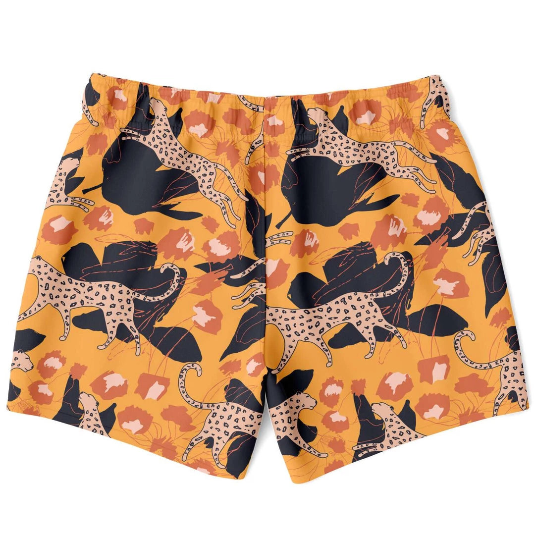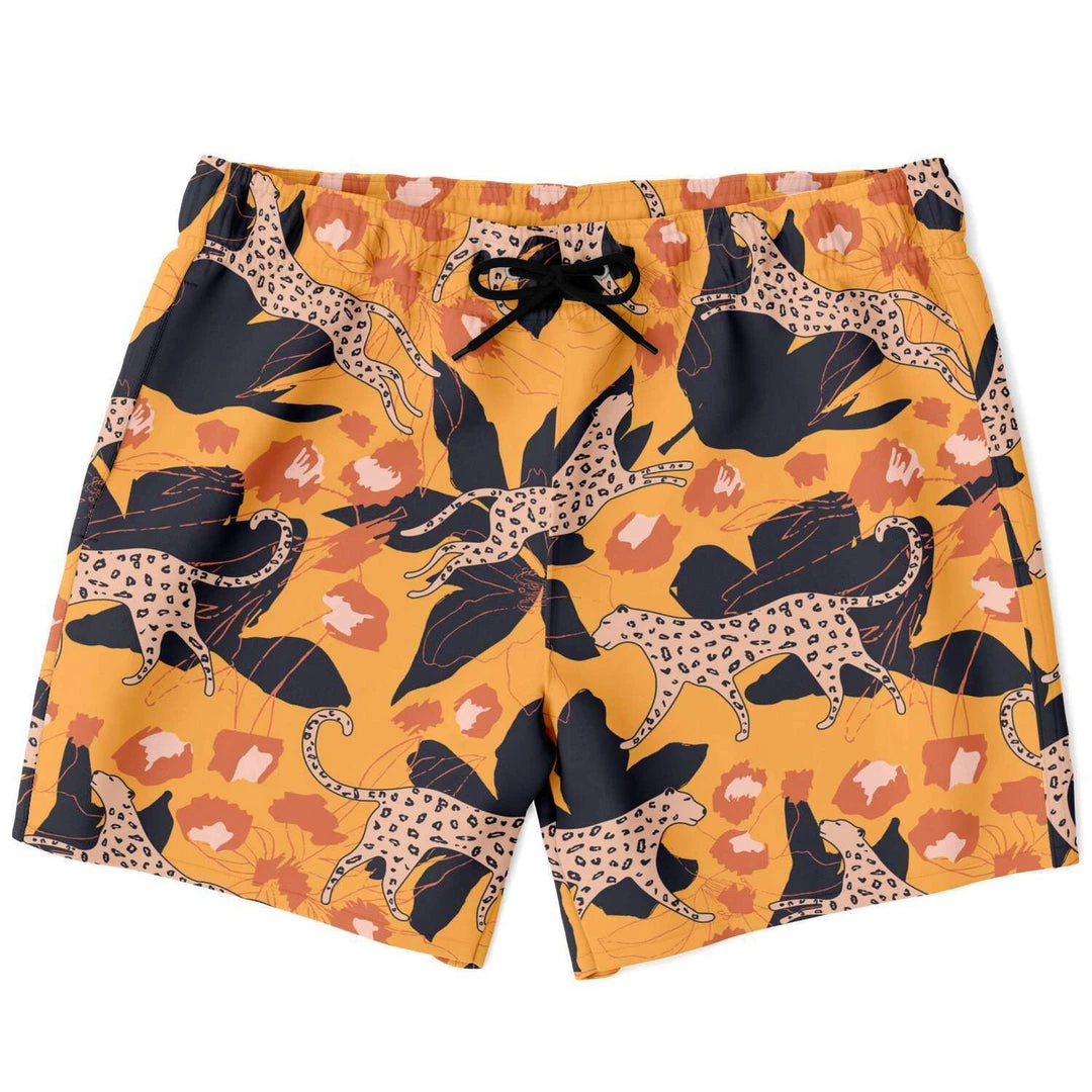 Our Jungle Leopard Swim Shorts feature a vibrant tribal print with leopards, and jungle vines in navy and orange. These short length swim trunks sit above the knee to show a bit of leg. They come in a fast-dry fabric, and feature a drawstring waistband, mesh basket lining and mesh-lined side pockets.