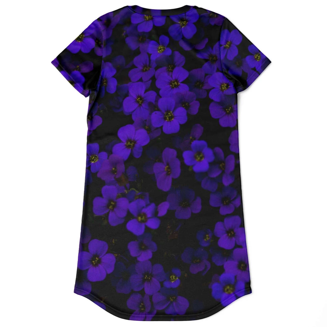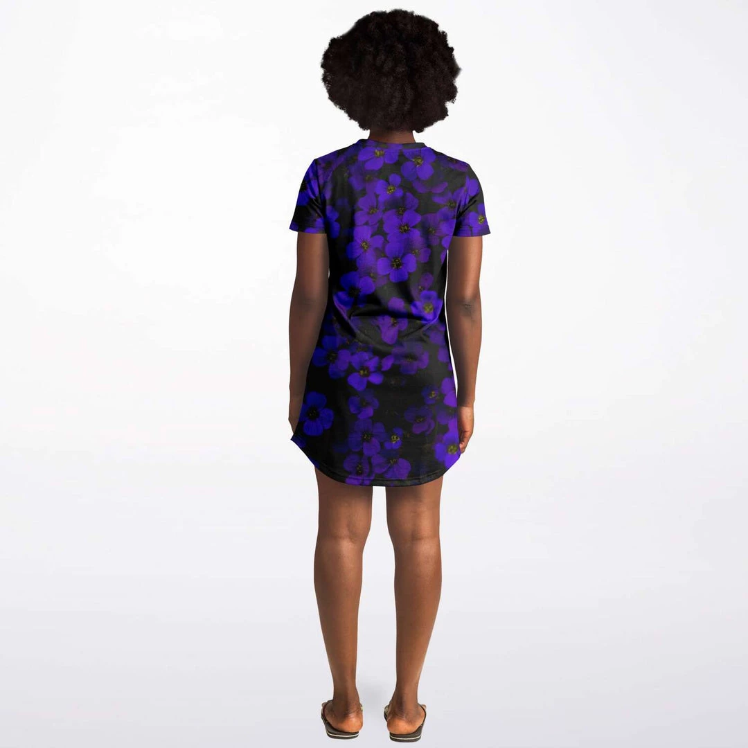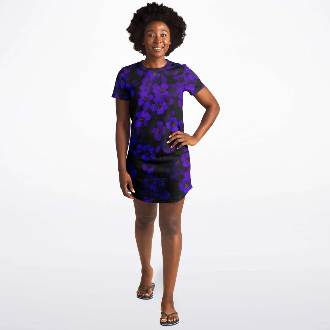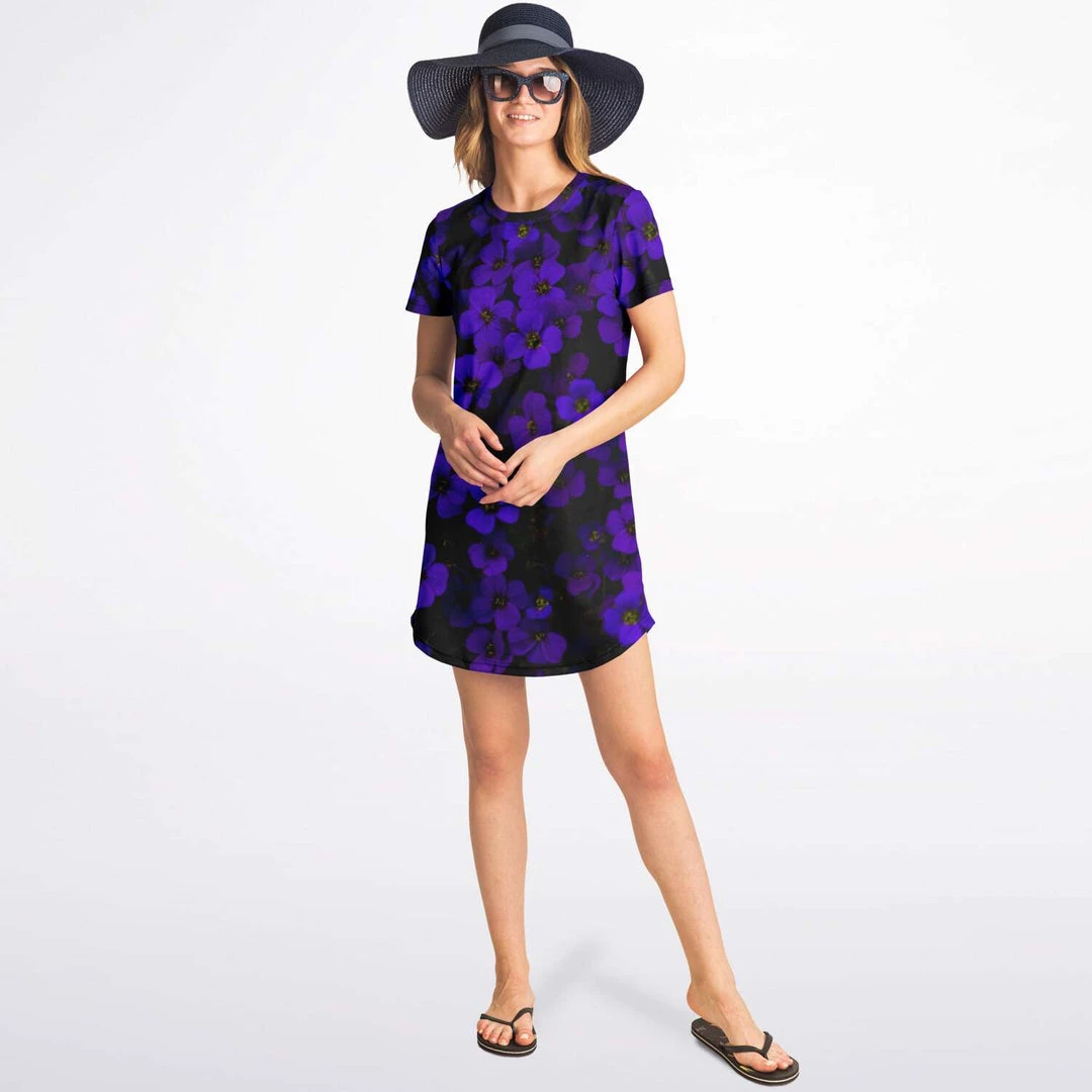 Our Midnight Purple Flower T shirt dress is simple, and stylish. It’s cute enough for everyday wear, but also special enough to wear out on the town. Perfect for summer but also looks great when layered over pants or leggings during colder months.