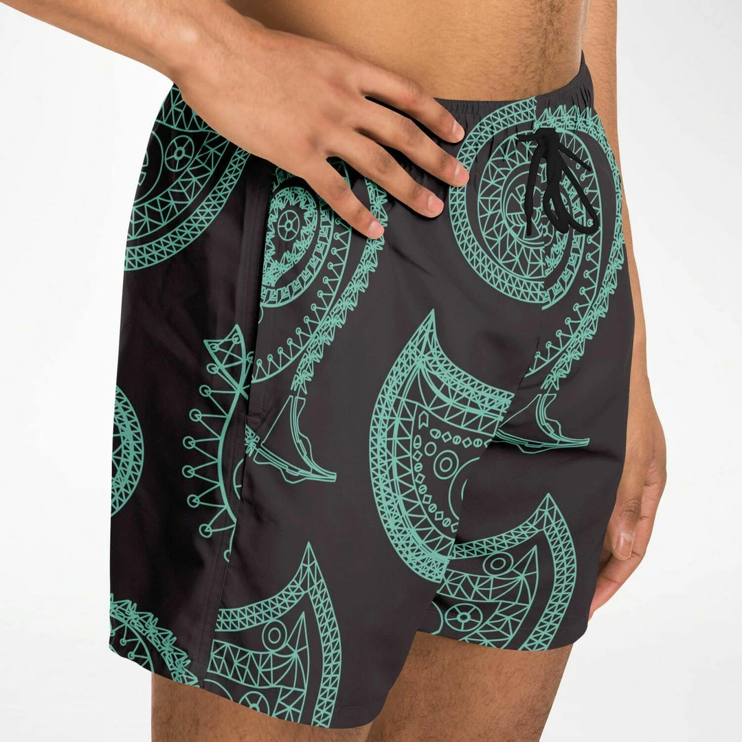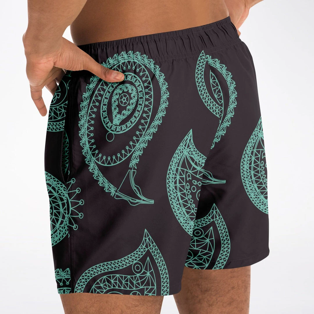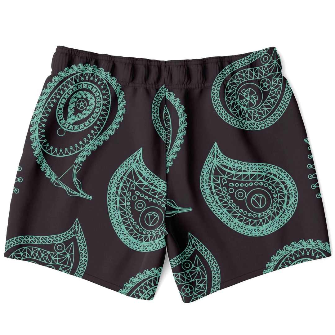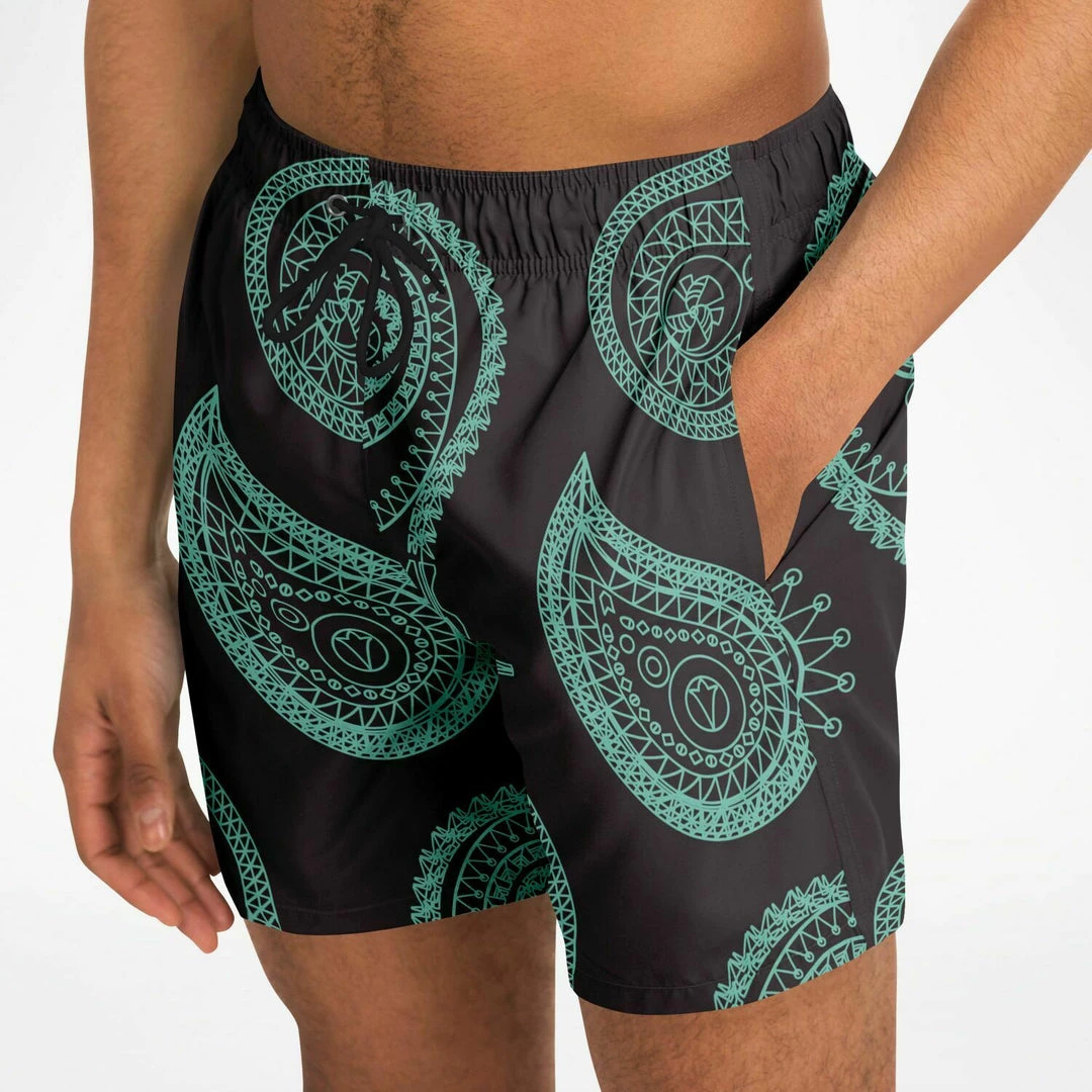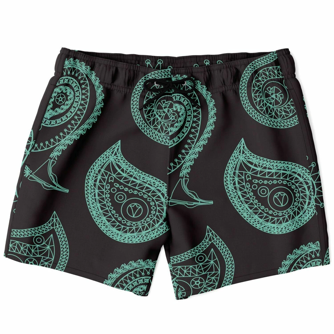 Our Mint Paisley Swim Shorts feature a classic paisley pattern in a contemporary mint green over black.