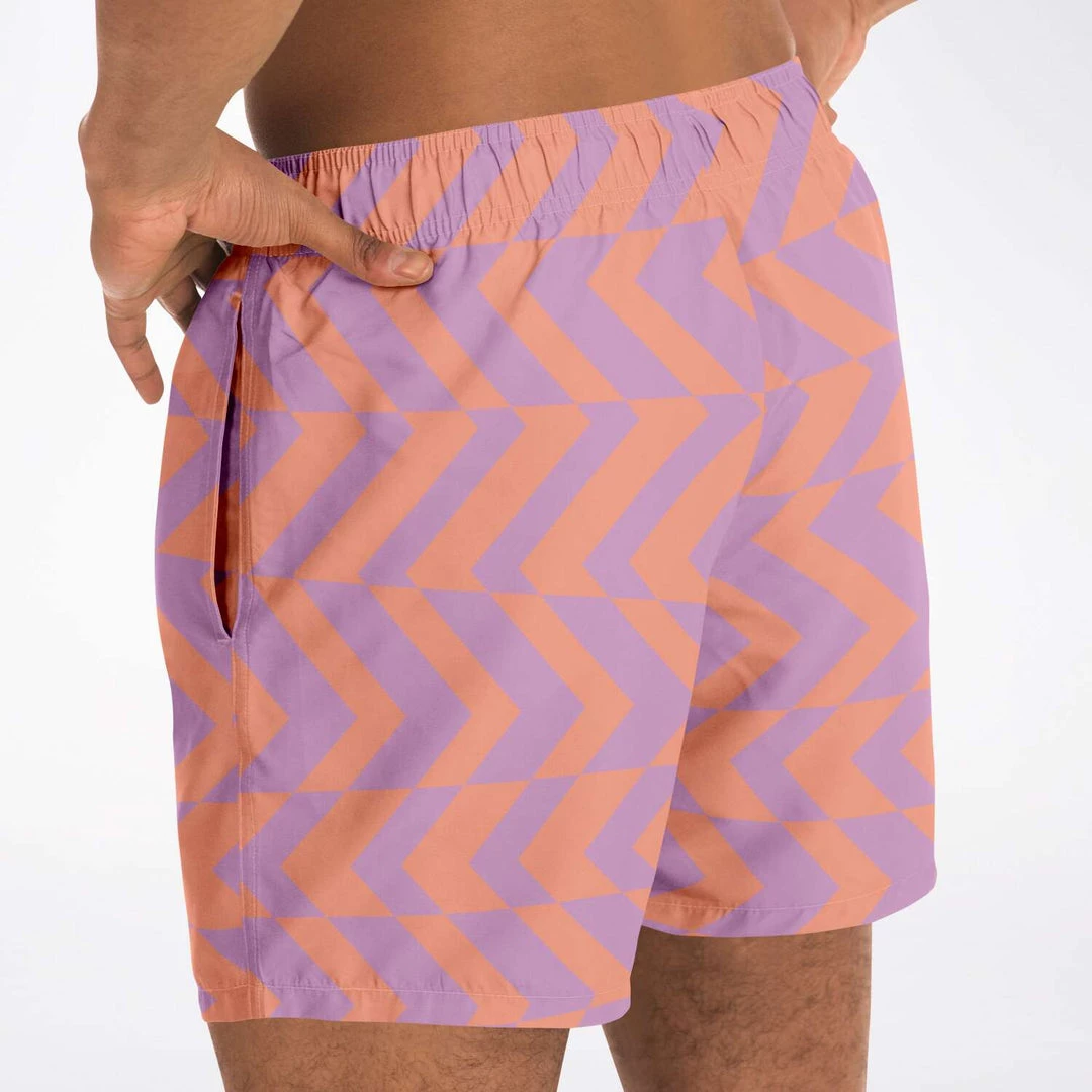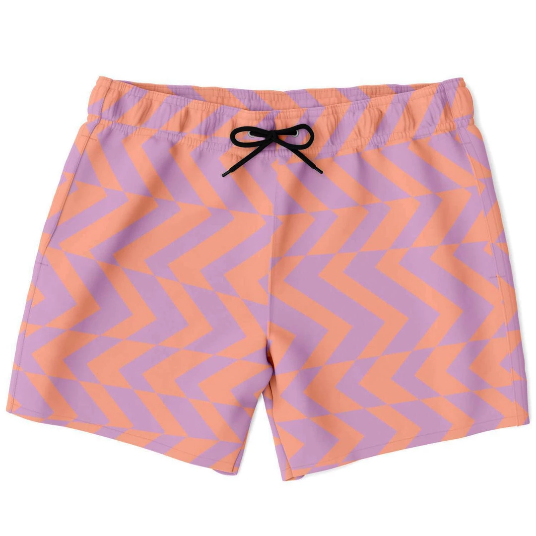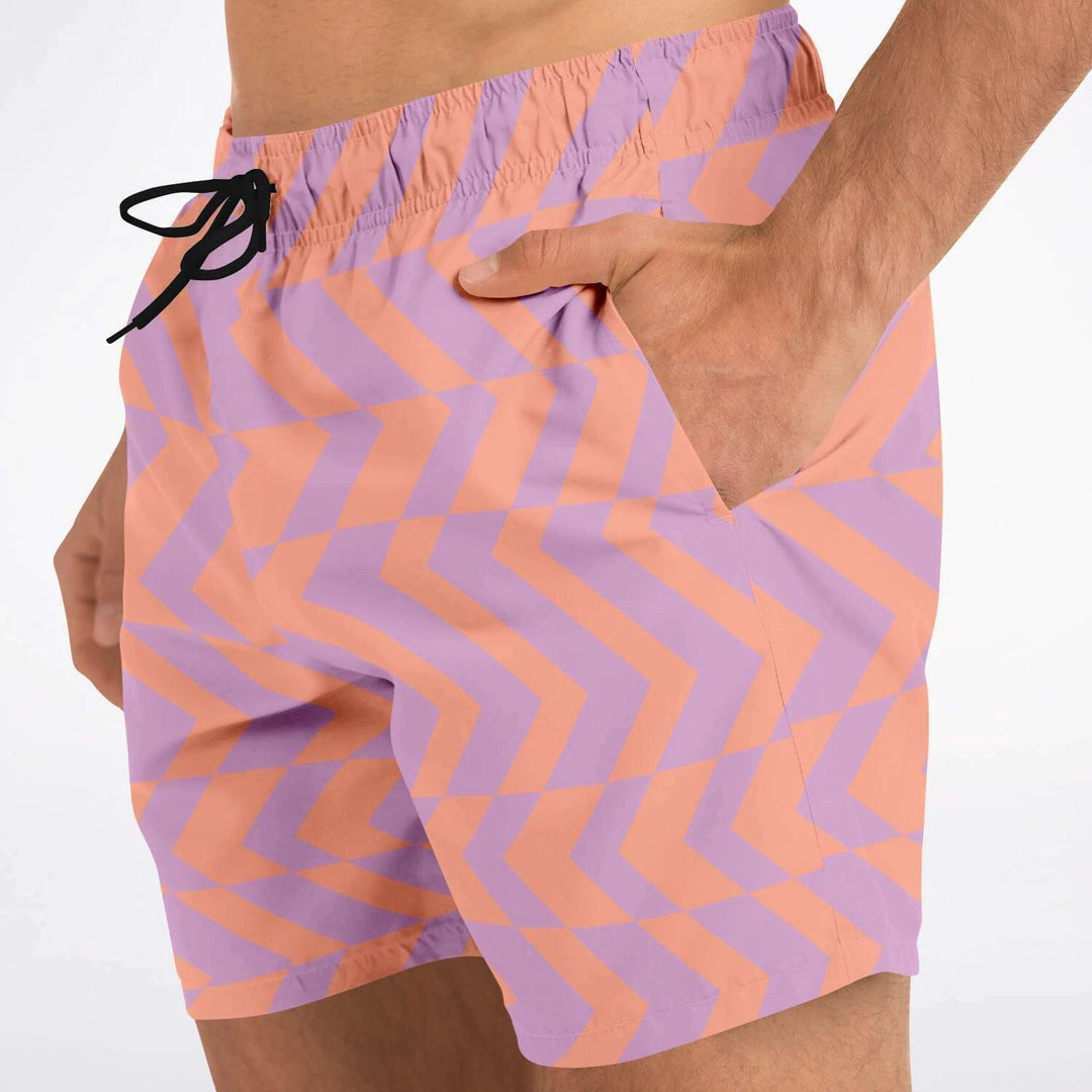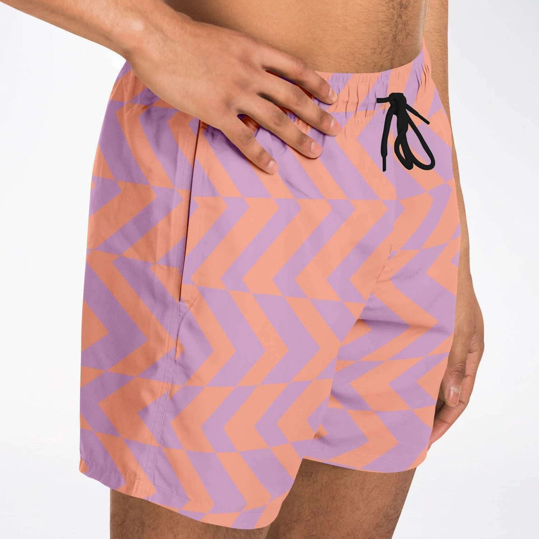 Our Peach & Orchid Abstract Striped Swim Shorts, feature a captivating abstract pattern in on-trend color tones. These short length swim trunks hit above the knee so you can show a bit of leg. They come in a fast-dry fabric, and feature a drawstring waistband, mesh basket lining and mesh-lined side pocket.