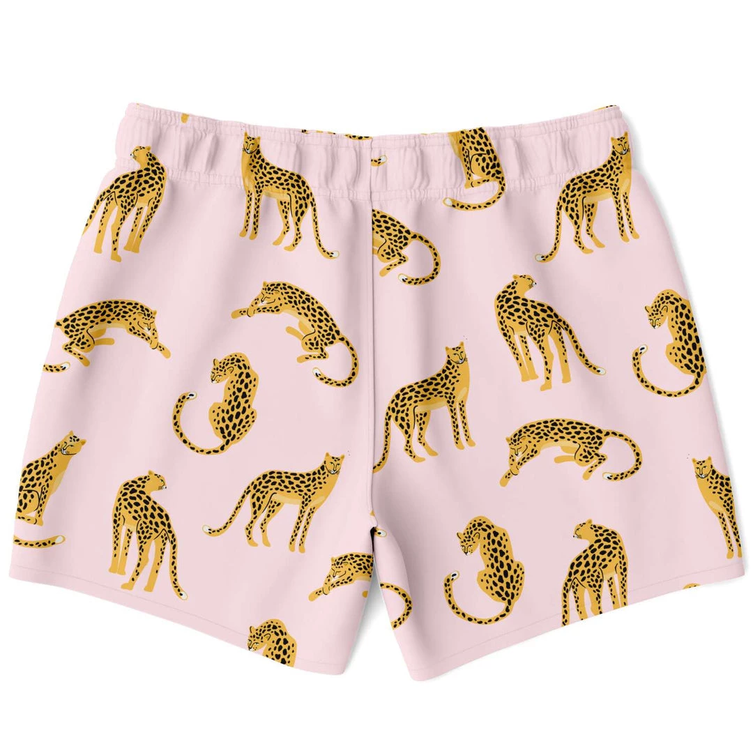 Our Pink Leopard Swim Shorts feature a stunning all over leopard print. A short fit, they hit above the knee and are made with a fast dry fabric. They also feature a white drawstring waistband, mesh basket lining and mesh-lined side pockets.