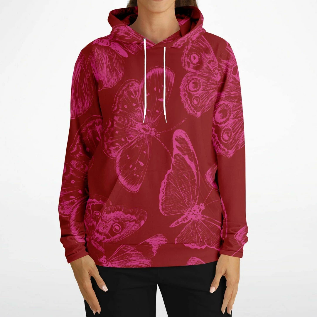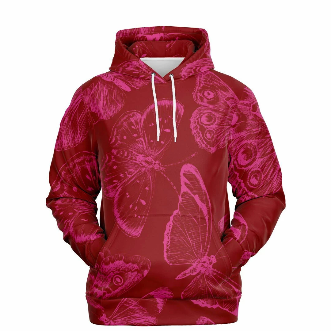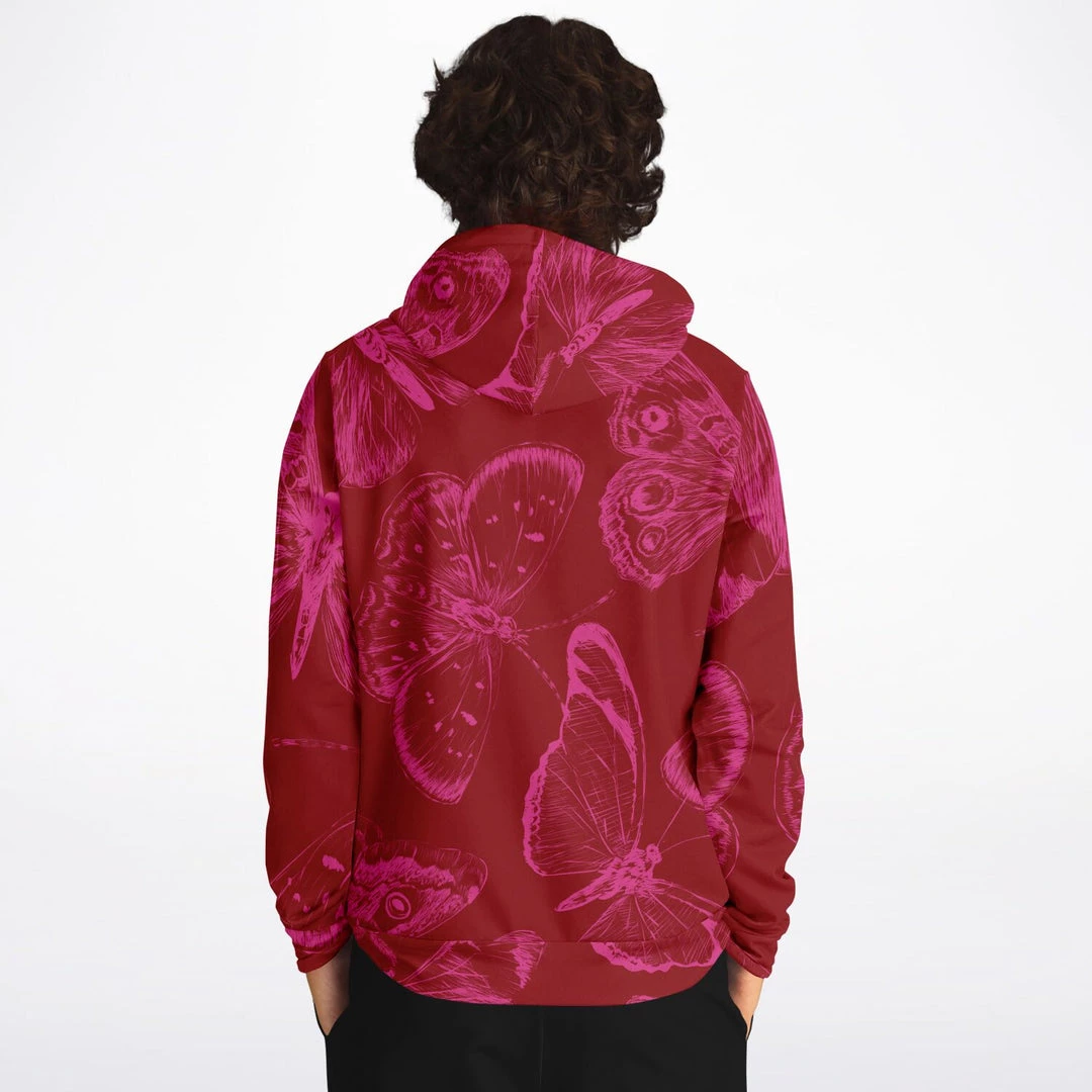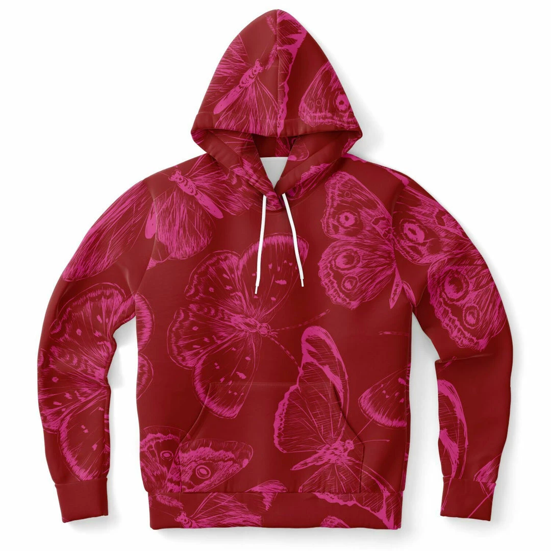 Our Red Fuchsia Butterflies Unisex Hoodie is totally unique. The all over vintage butterfly print in fuchsia and deep red is literally striking.
