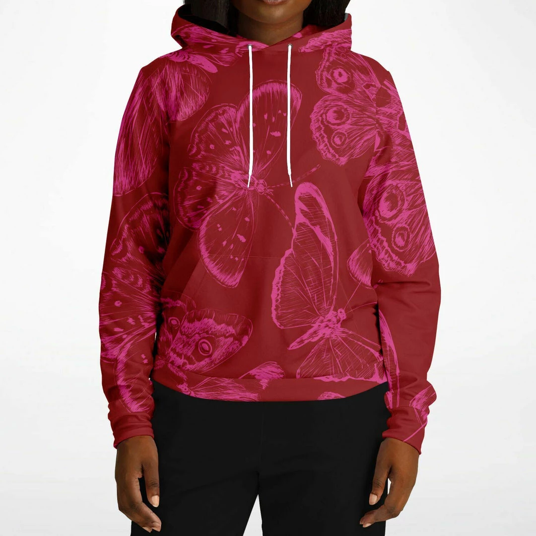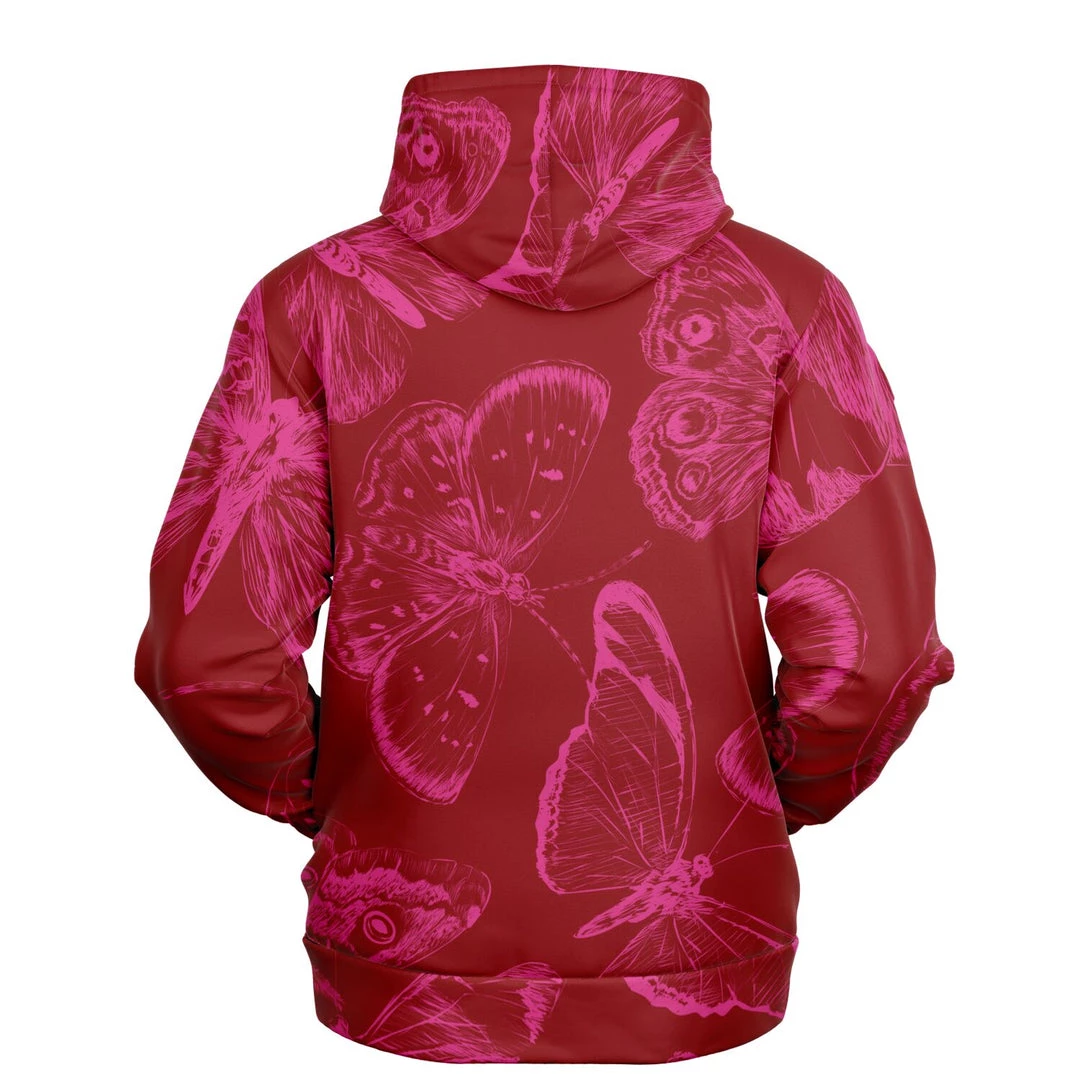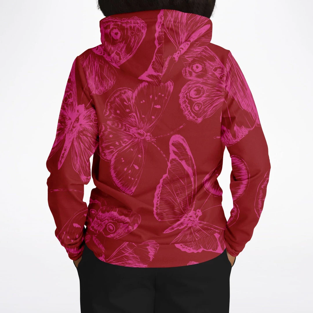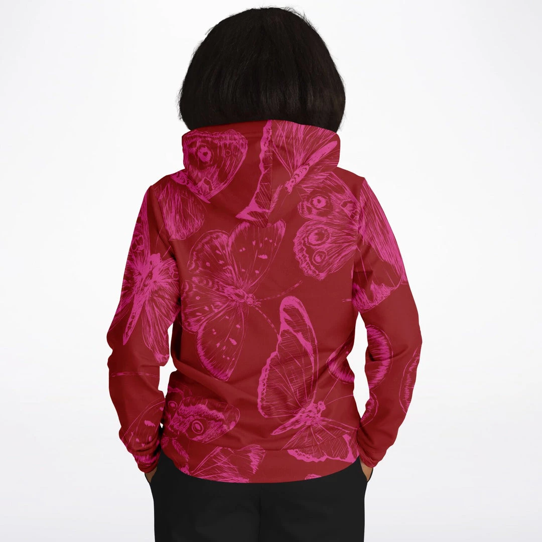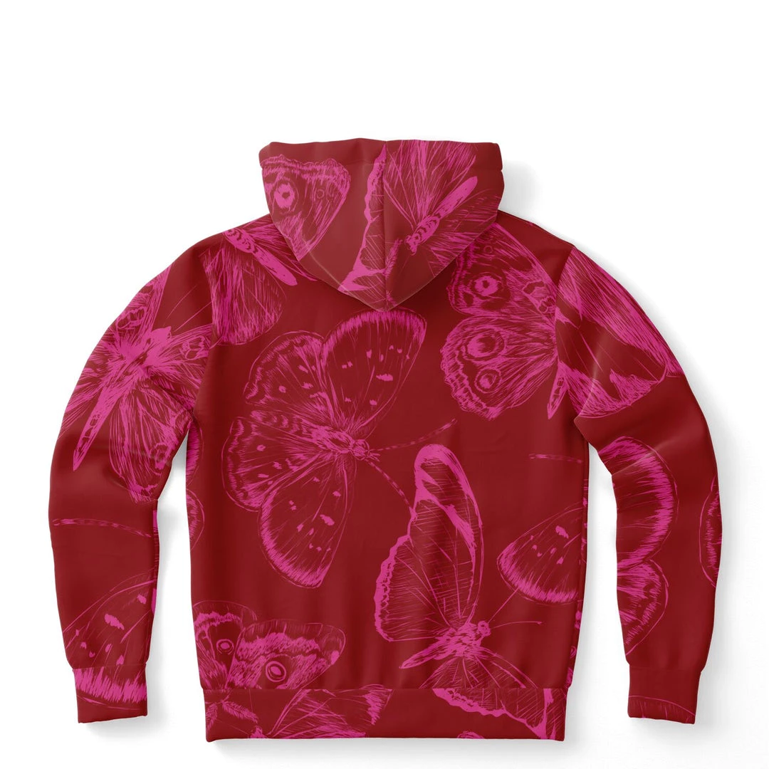 Our Red Fuchsia Butterflies Unisex Hoodie is totally unique. The all over vintage butterfly print in fuchsia and deep red is literally striking.