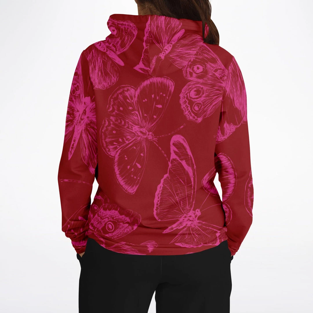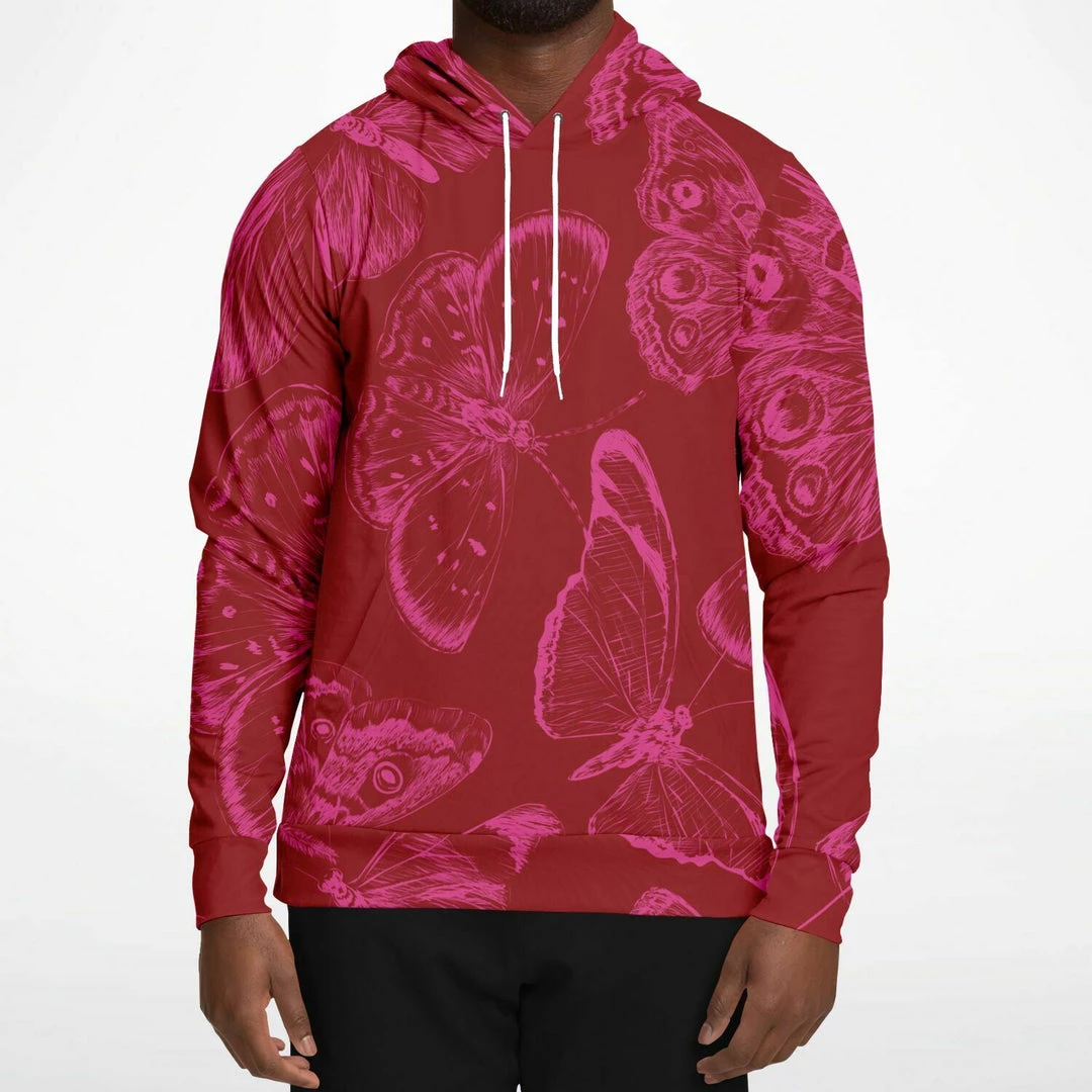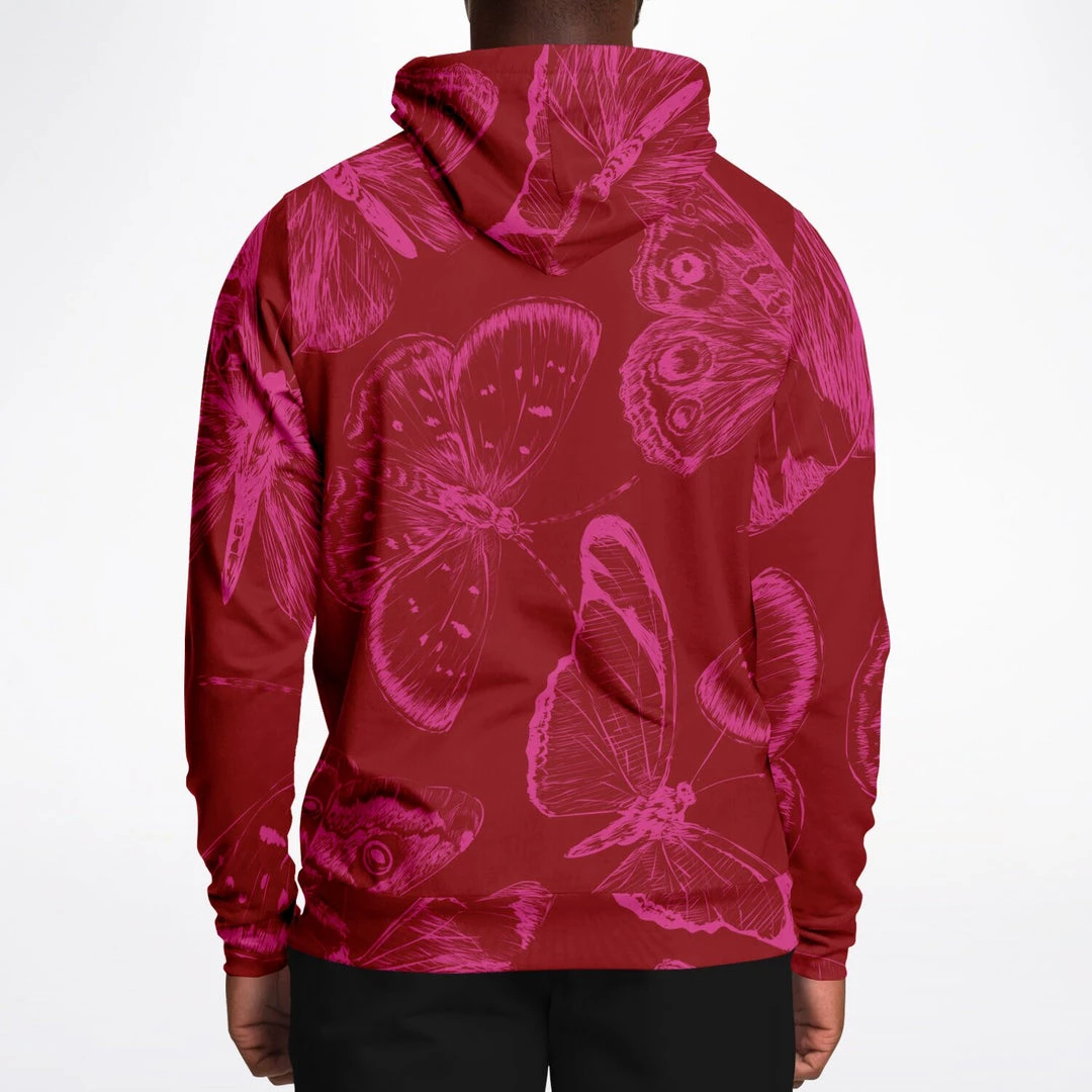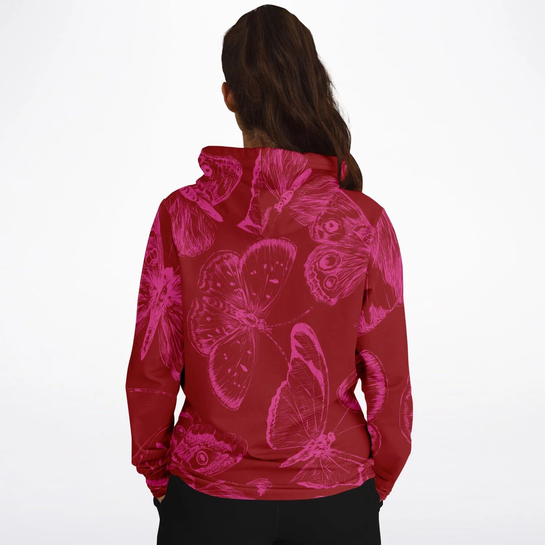 Our Red Fuchsia Butterflies Unisex Hoodie is totally unique. The all over vintage butterfly print in fuchsia and deep red is literally striking.