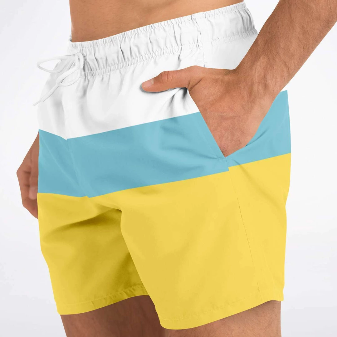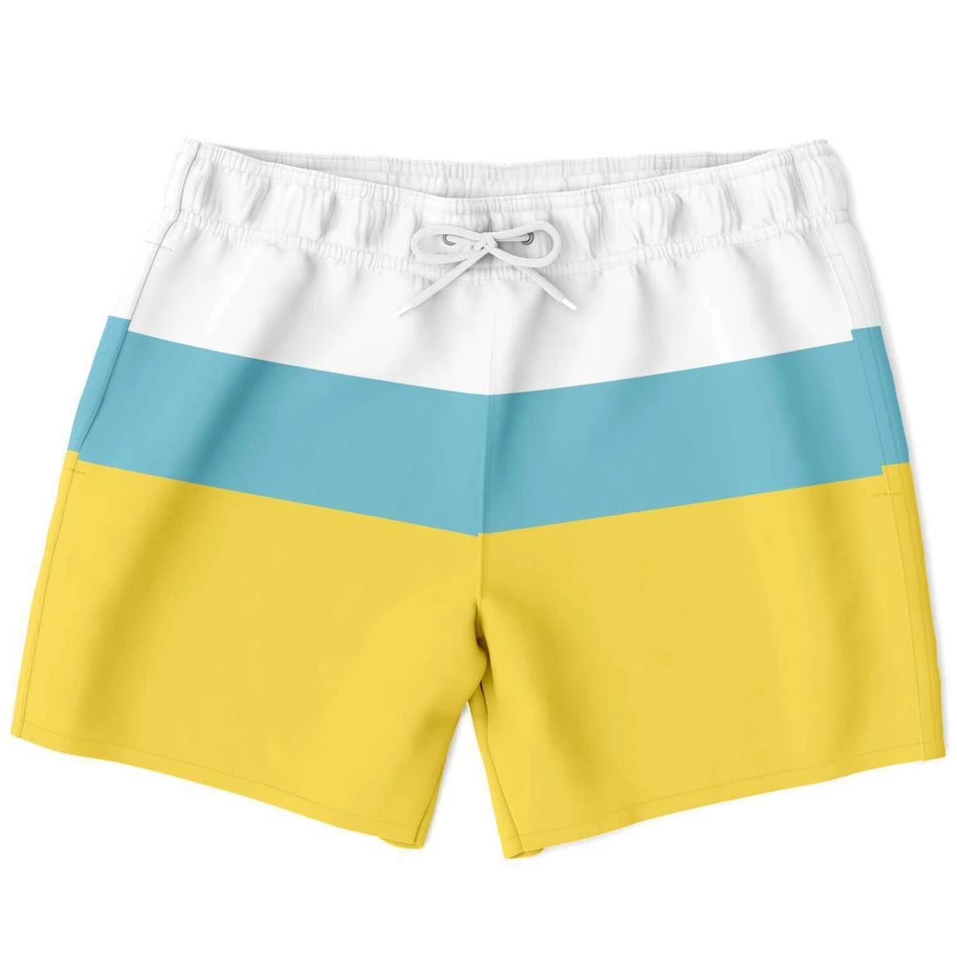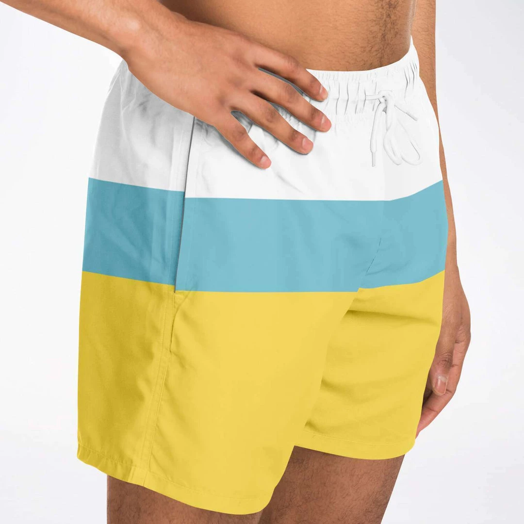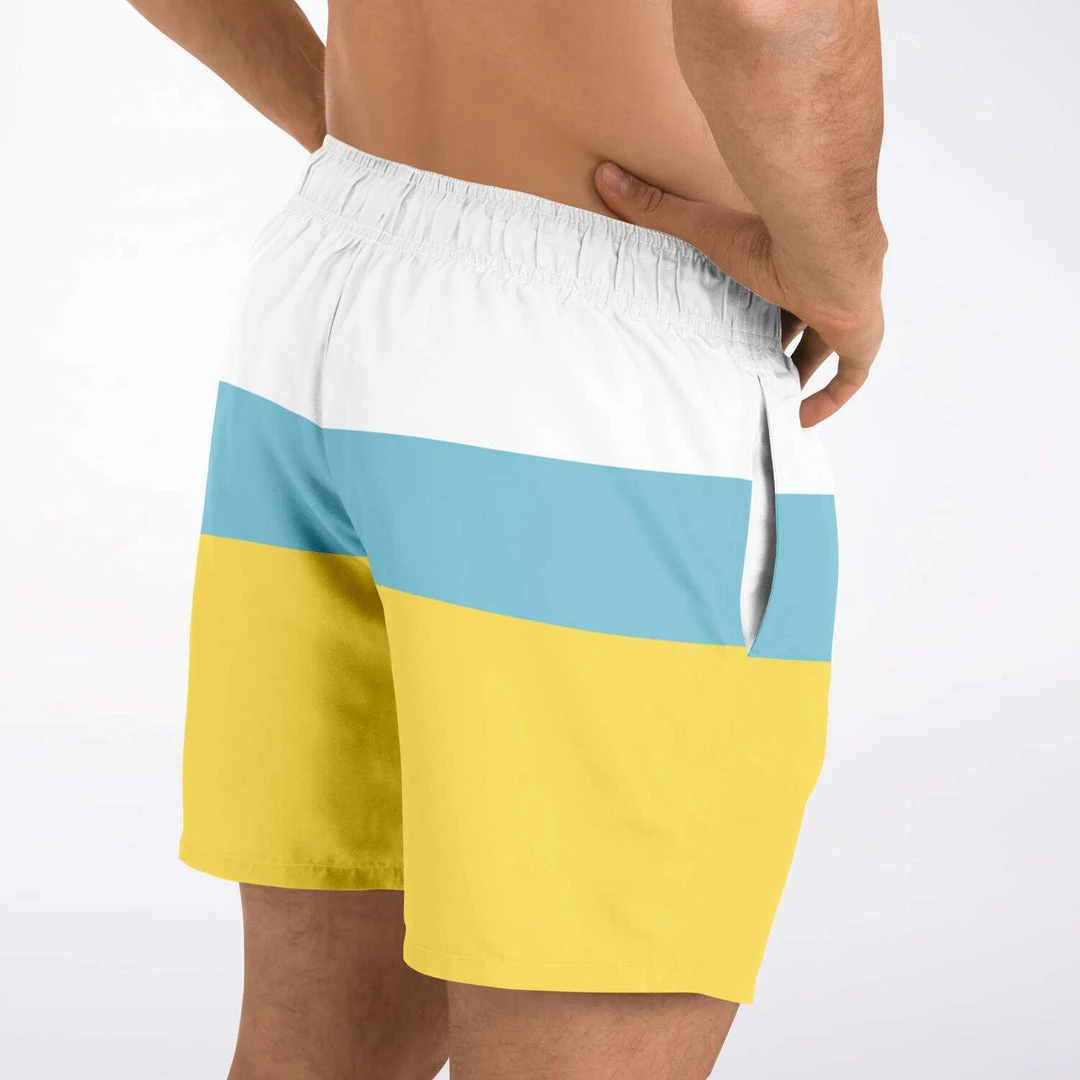 Our Sand & Sea Swim Shorts feature a simple yellow, blue and stripe design inspired by the Sand and Sea. These short length swim trunks fit above the knee so you can show some leg. They come in a fast-dry fabric, and feature a drawstring waistband, mesh basket lining and mesh-lined side pockets.