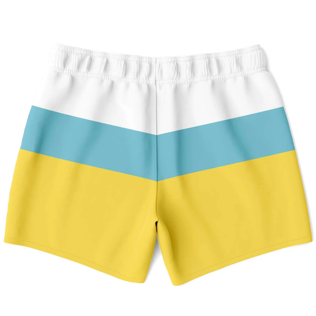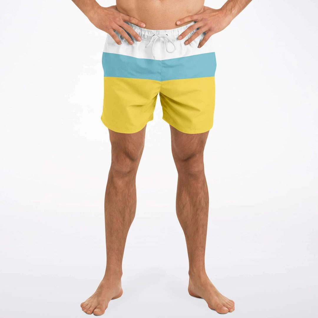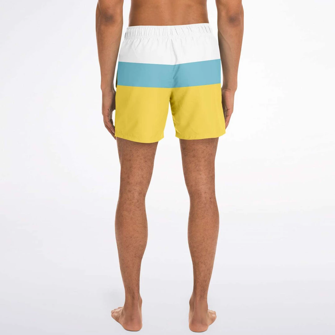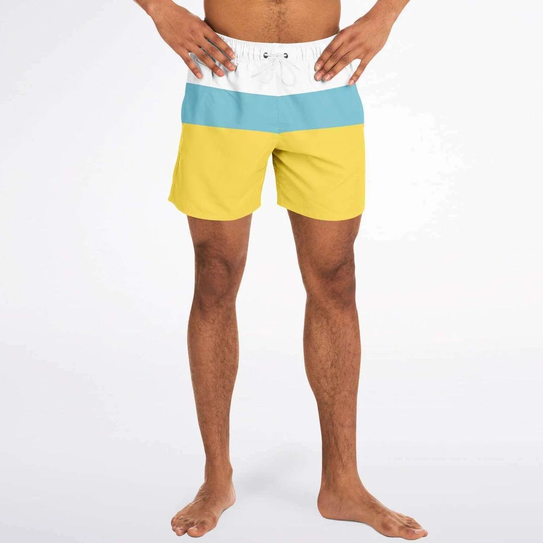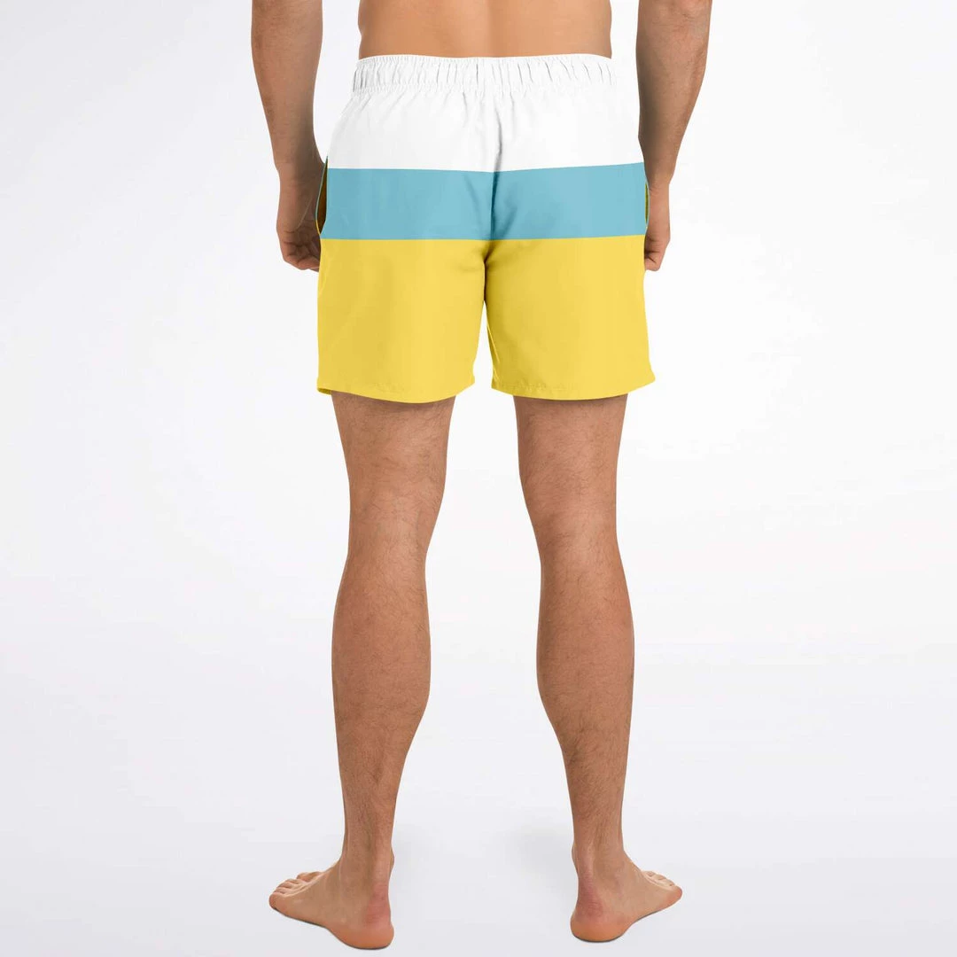 Our Sand & Sea Swim Shorts feature a simple yellow, blue and stripe design inspired by the Sand and Sea. These short length swim trunks fit above the knee so you can show some leg. They come in a fast-dry fabric, and feature a drawstring waistband, mesh basket lining and mesh-lined side pockets.