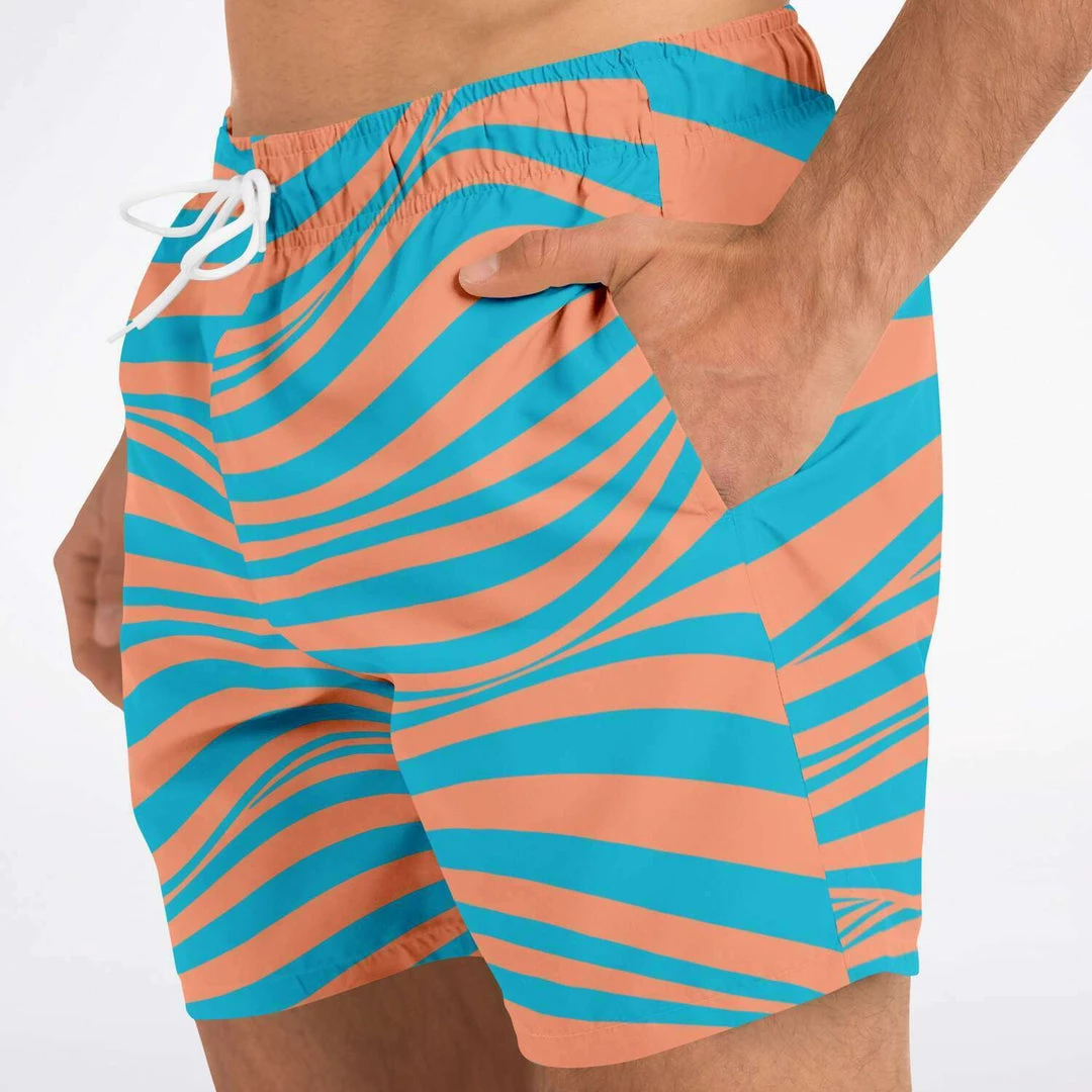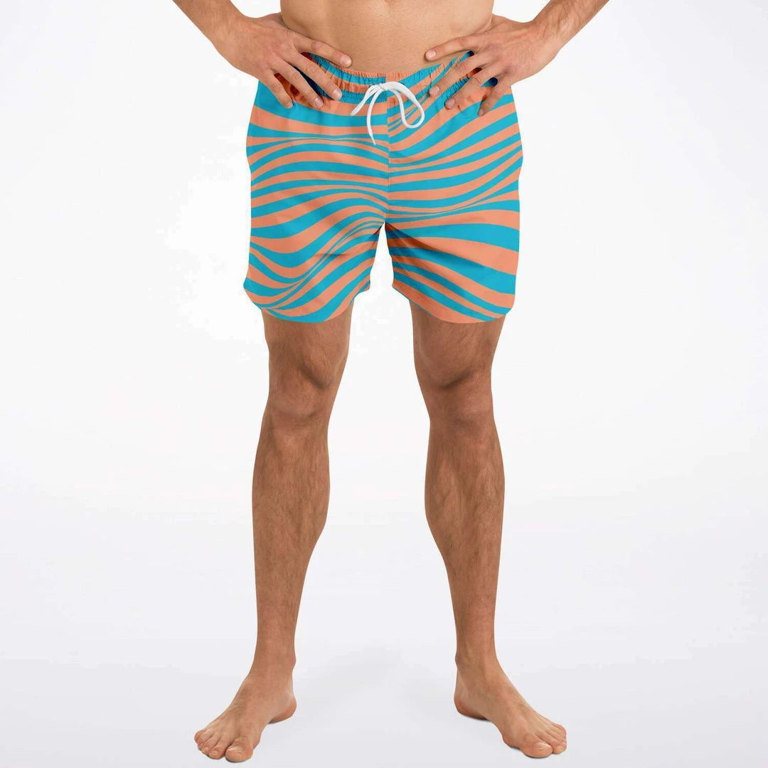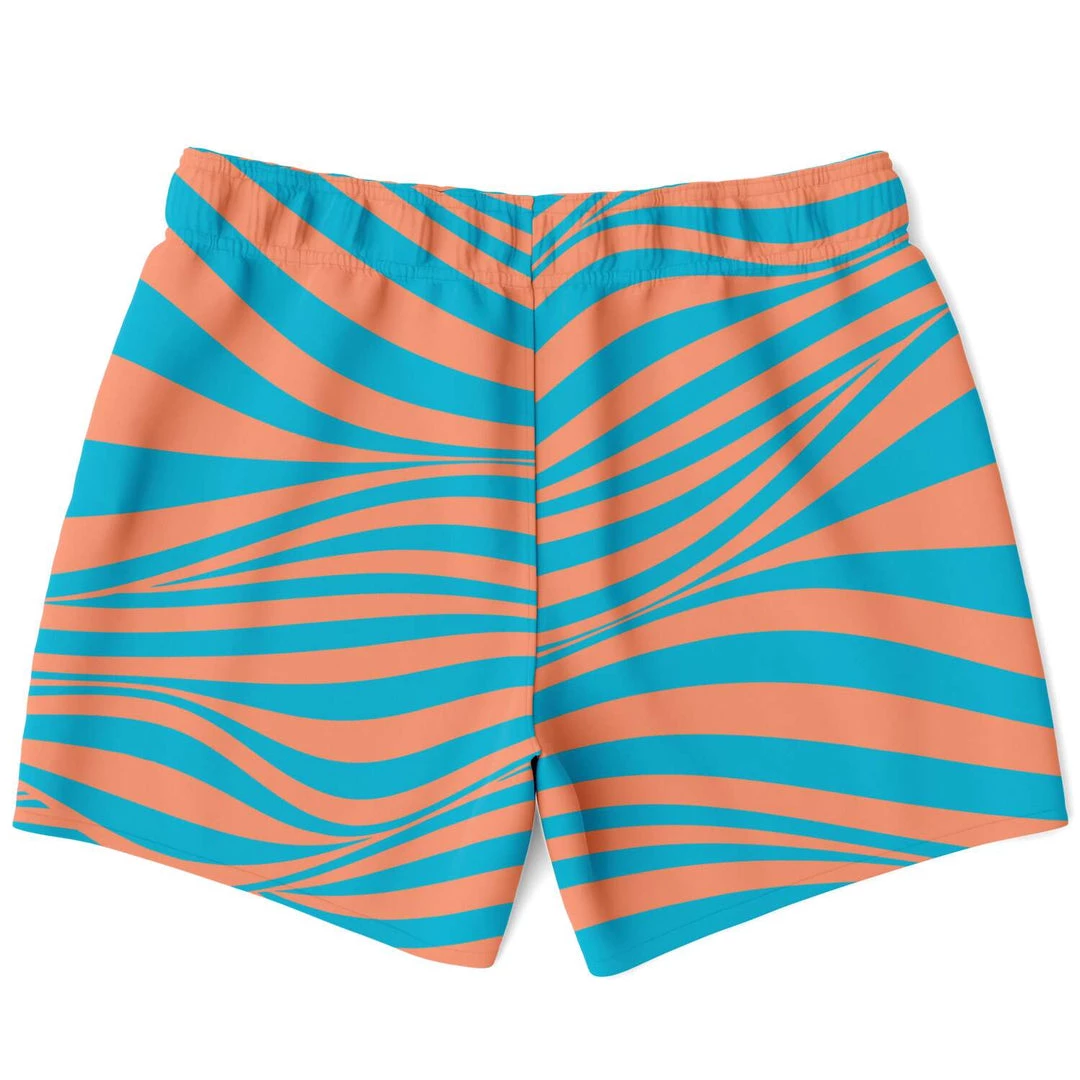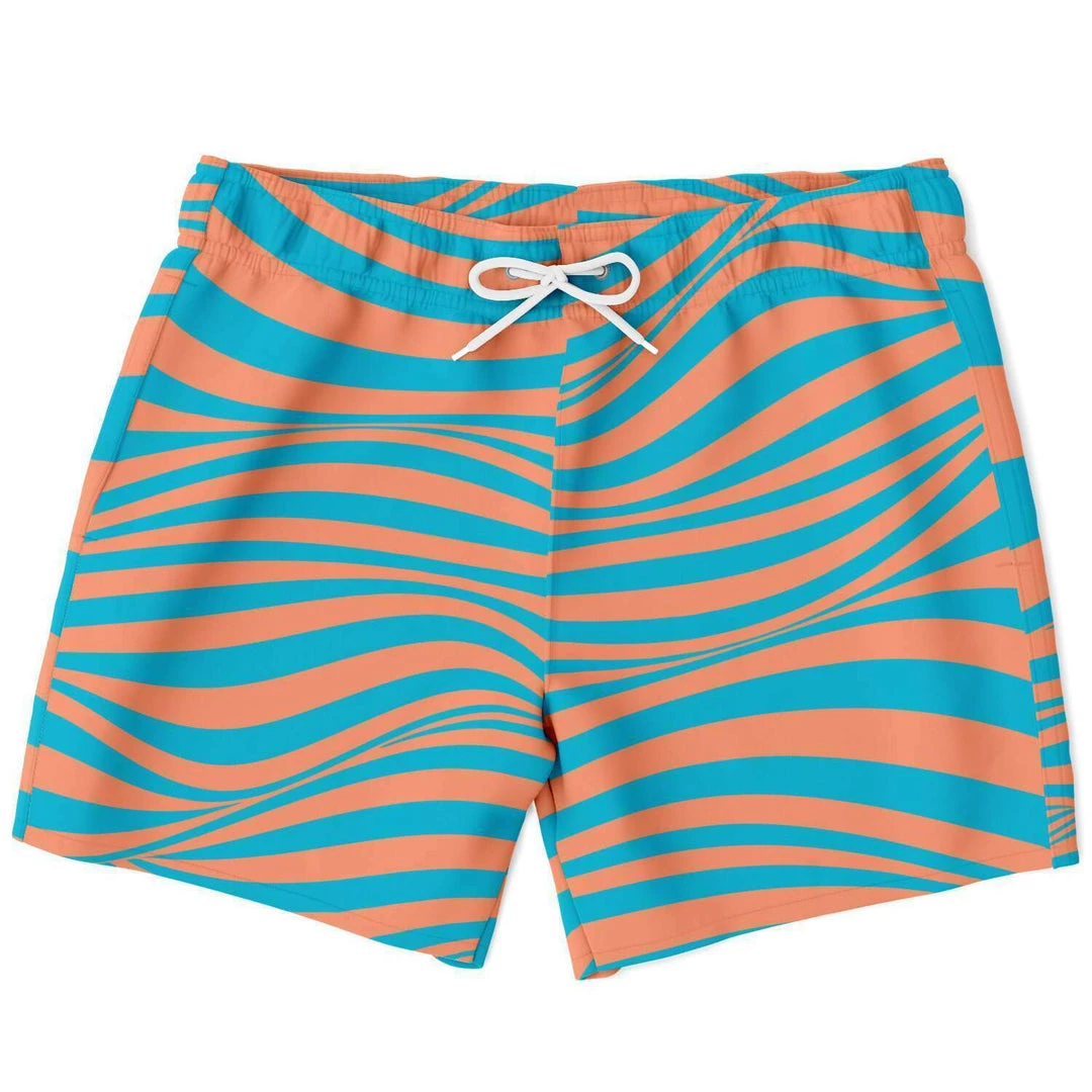 Our Sunset Water Swim Shorts feature a super cool water ripple pattern in blue and orange – perfect for Summer.