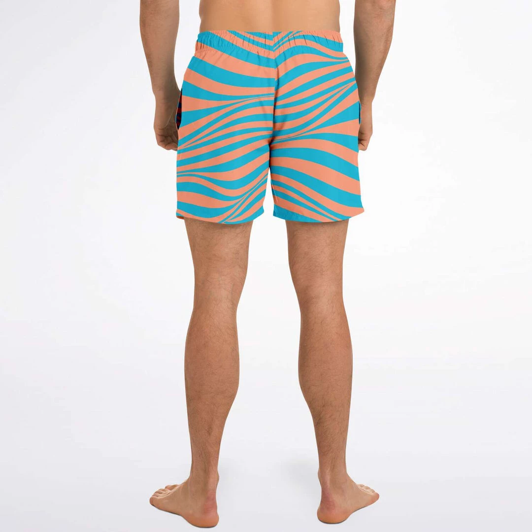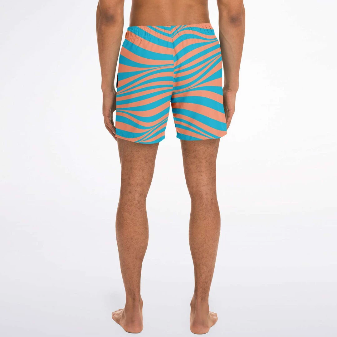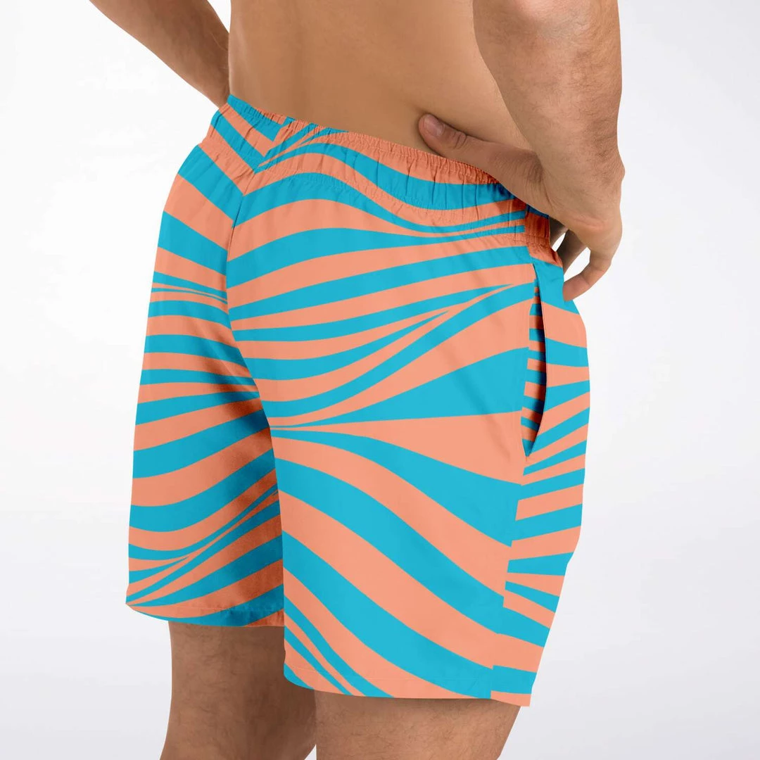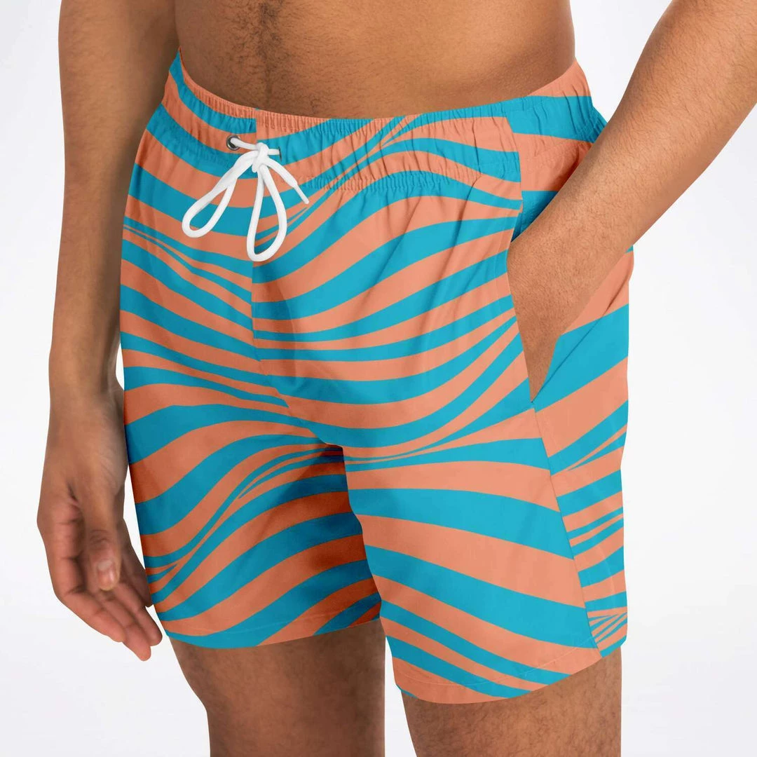 Our Sunset Water Swim Shorts feature a super cool water ripple pattern in blue and orange – perfect for Summer.