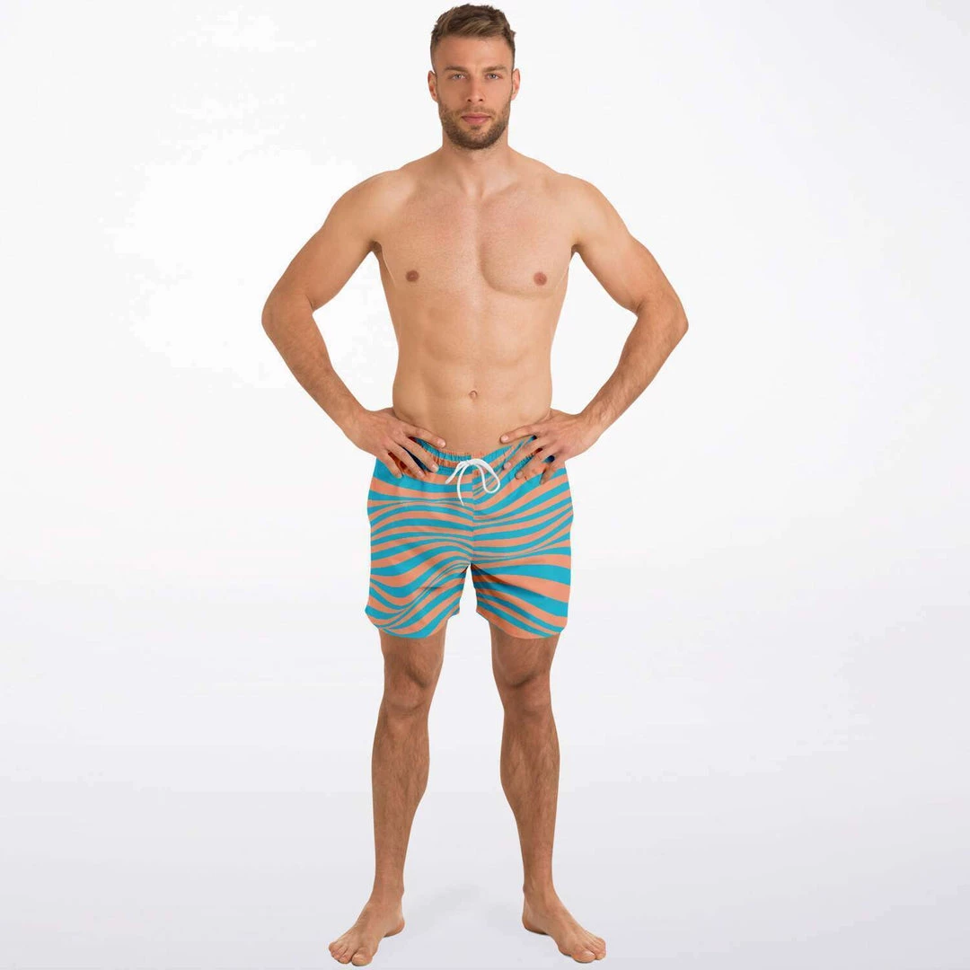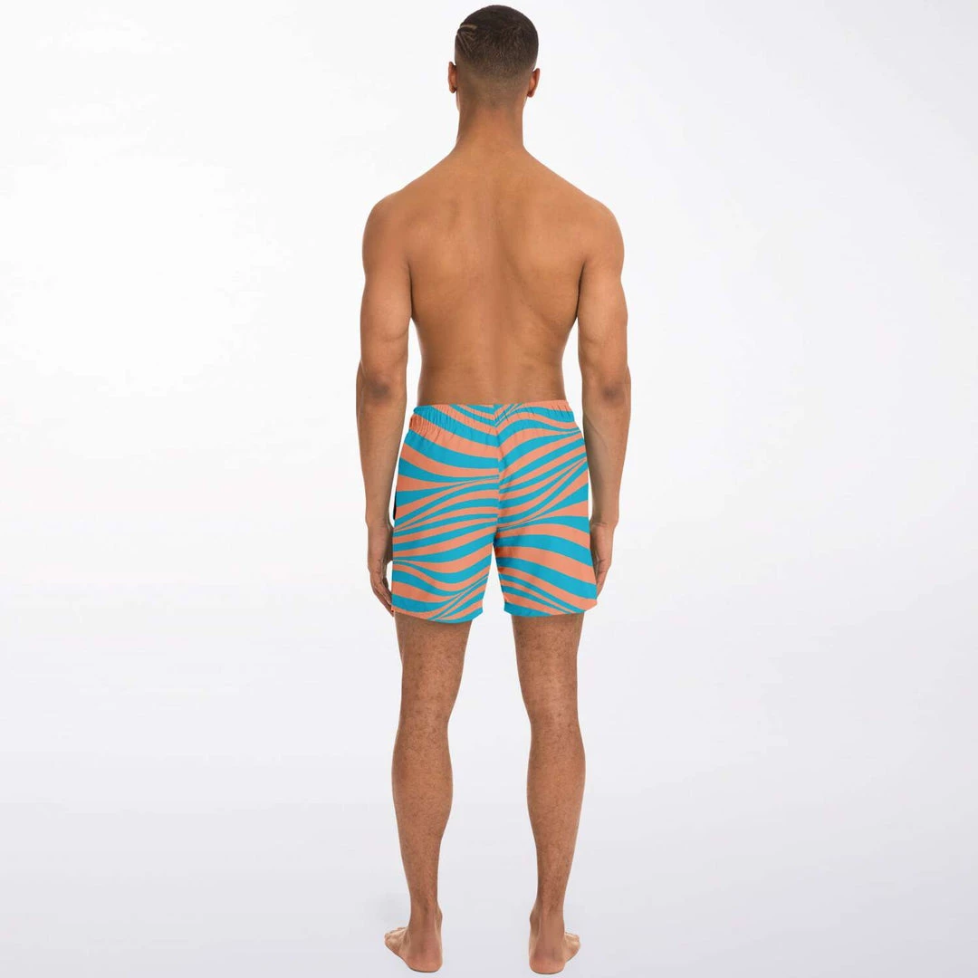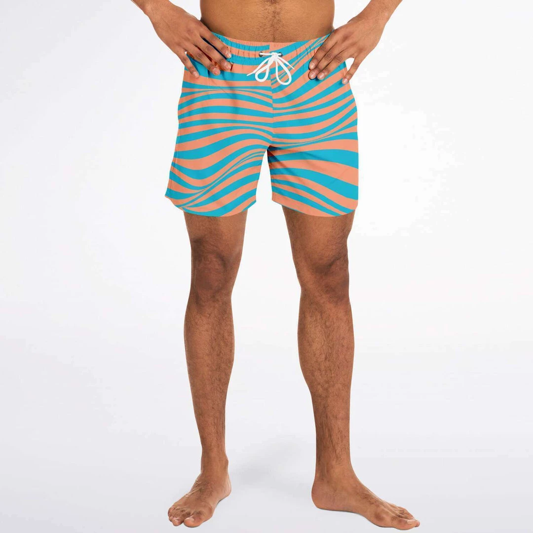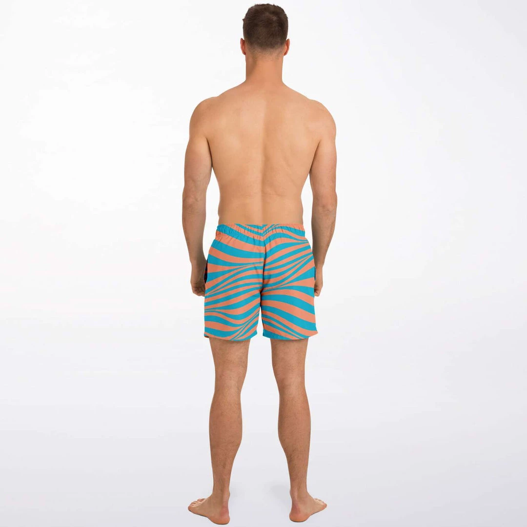 Our Sunset Water Swim Shorts feature a super cool water ripple pattern in blue and orange – perfect for Summer.