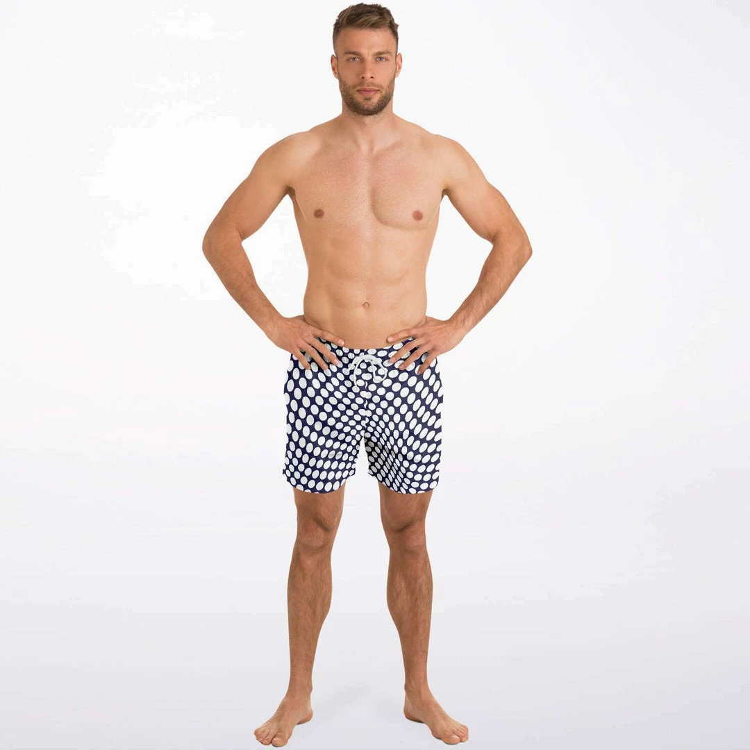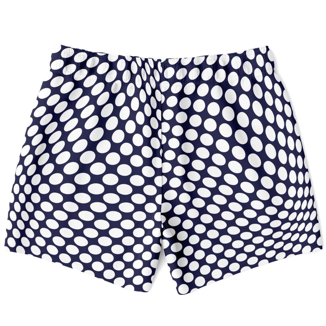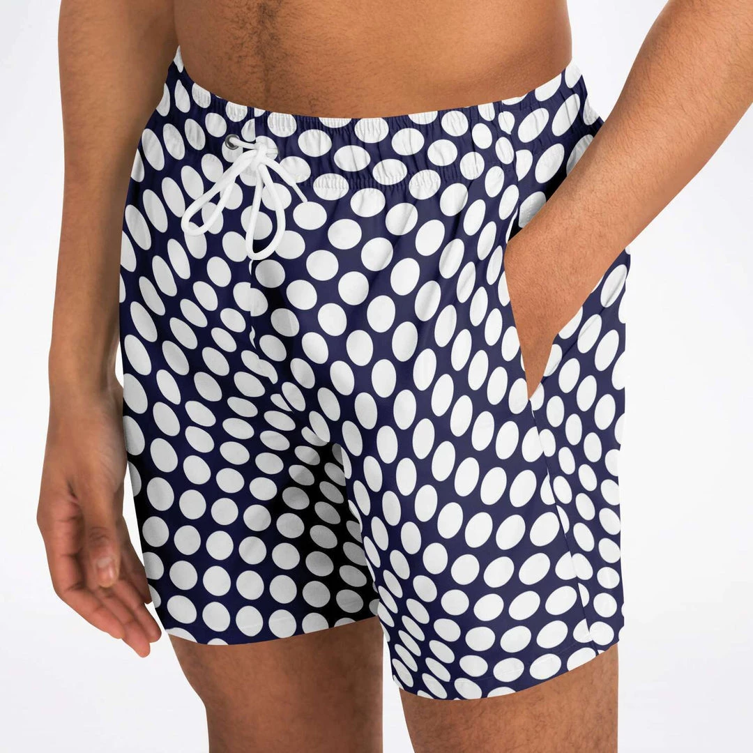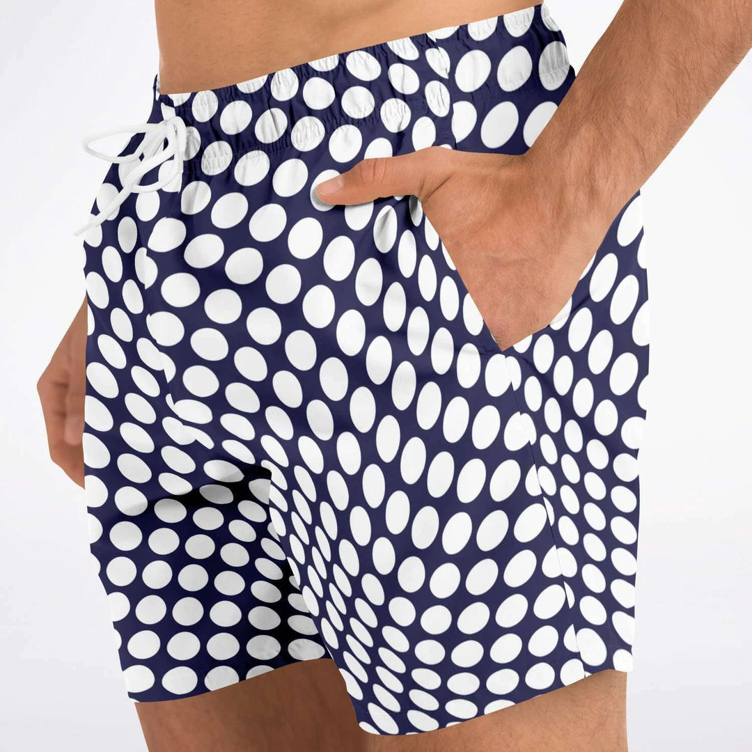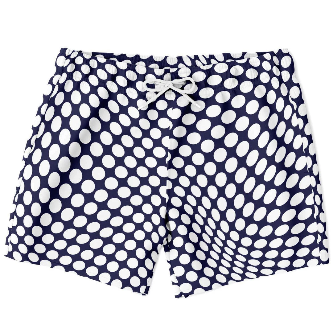 Our Whirlpool Polkadot Swim Shorts, feature an all over swirl polkadot pattern in dark blue. These shorter-length swim trunks hit above the knee so you can show a bit of leg. They come in a fast-dry fabric, and feature a drawstring waistband, mesh basket lining and mesh-lined side pockets.