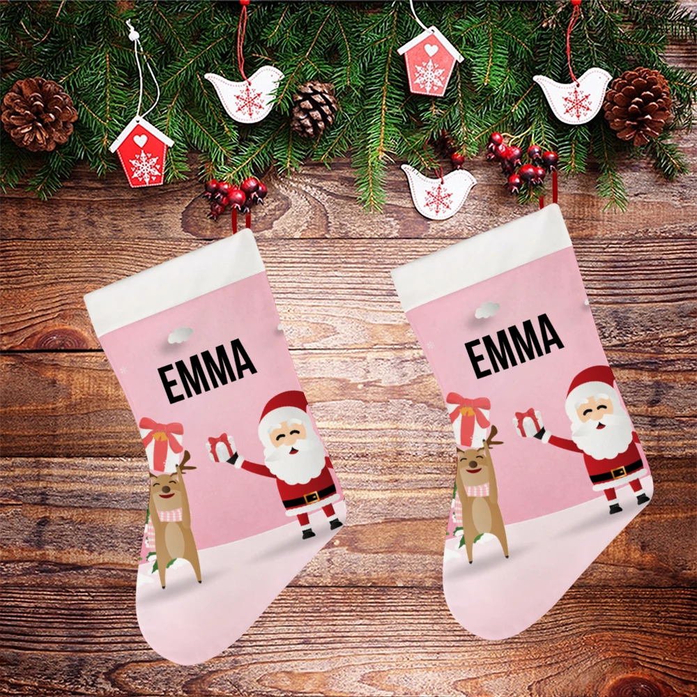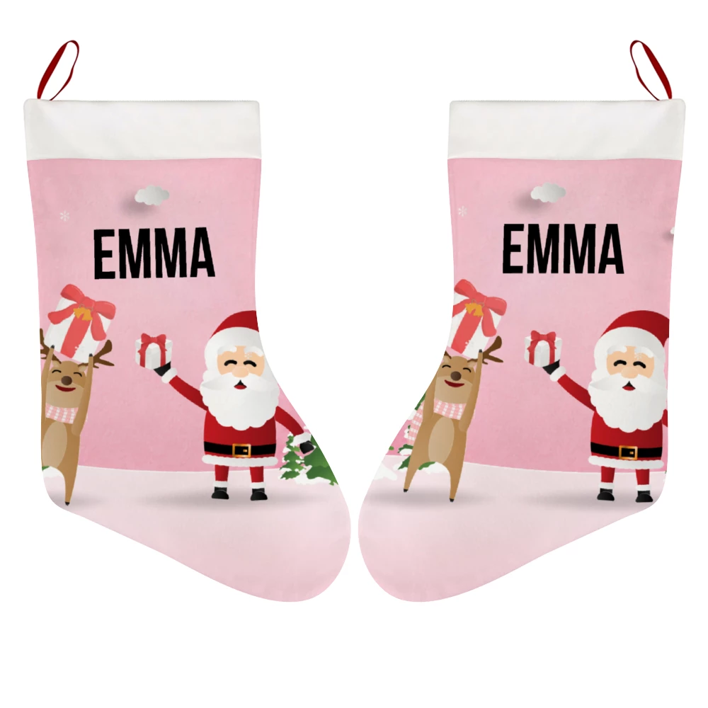 Personalize this super cute Christmas stocking with a custom name. This design features Santa and a reindeer. Make it your own with unique personalization as a gift or cherished Christmas memory.